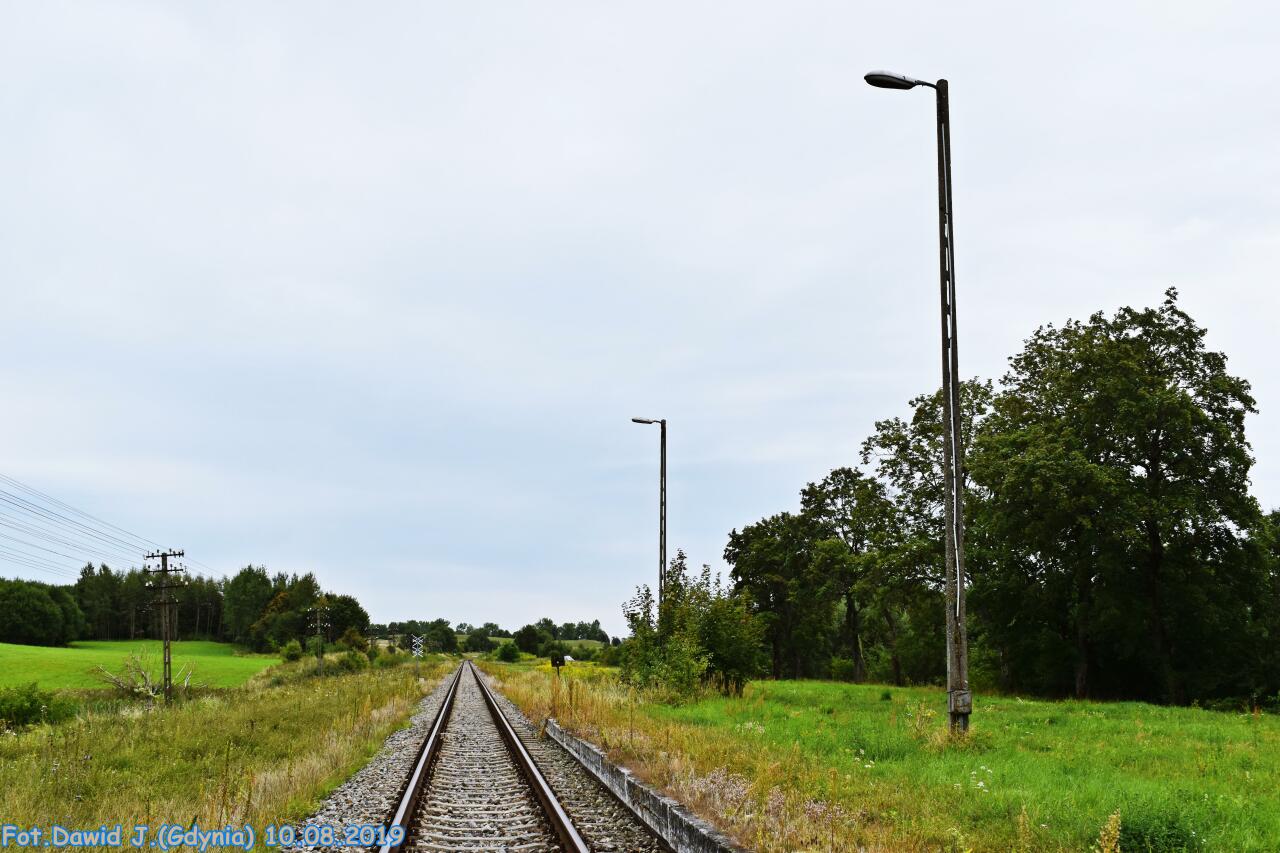 Widok z peronu w kierunku Orzysza, Czerwonki, Olsztyna Głównego. Tablica z nazwą przystanku osobowego.