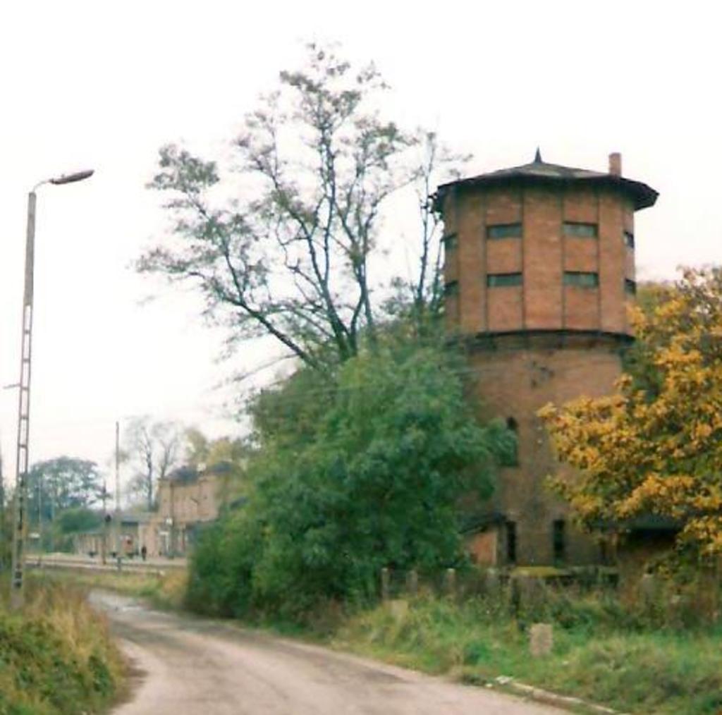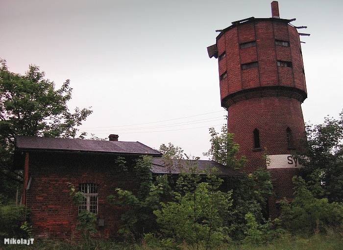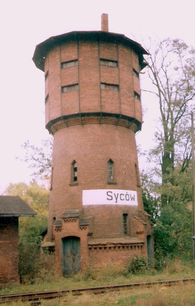 Syców. Wieża wodna z nazwą stacji w 1998 r.