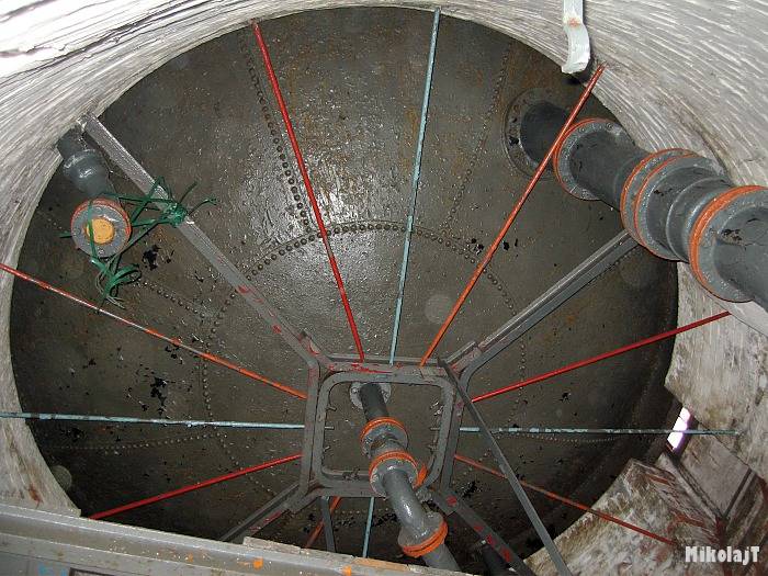 Wieża wodna - wnętrze. Można wejść do środka, schody wiodące ku górze grożą zawaleniem więc wchodzi sie z drżeniem serca. Gdy spojrzymy w górę widzimy olbrzymi zbiornik na wodę - coś wspaniałego.