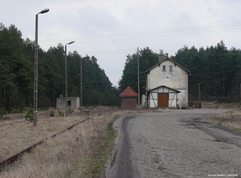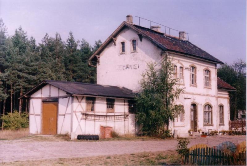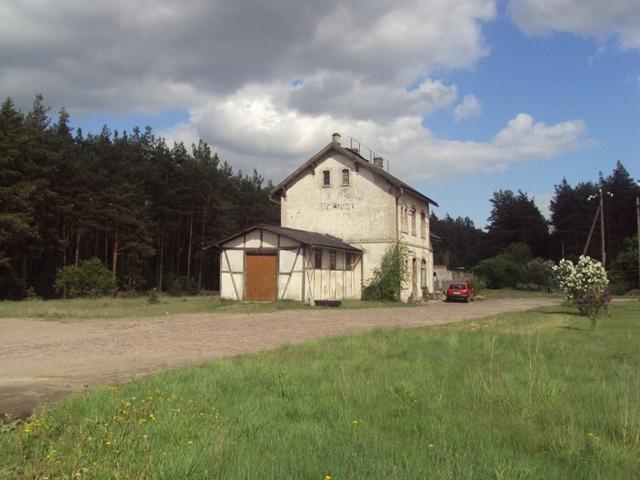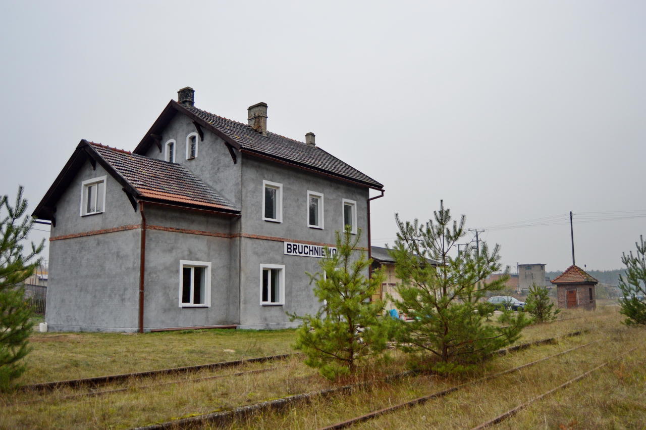 Dawny budynek dworcowy z przyległym budynkiem magazynu, widoczny od strony miejsca, w którym kiedyś znajdowały się tory. W lewo Terespol Pomorski, w prawo Pruszcz Bagienica/Złotów.