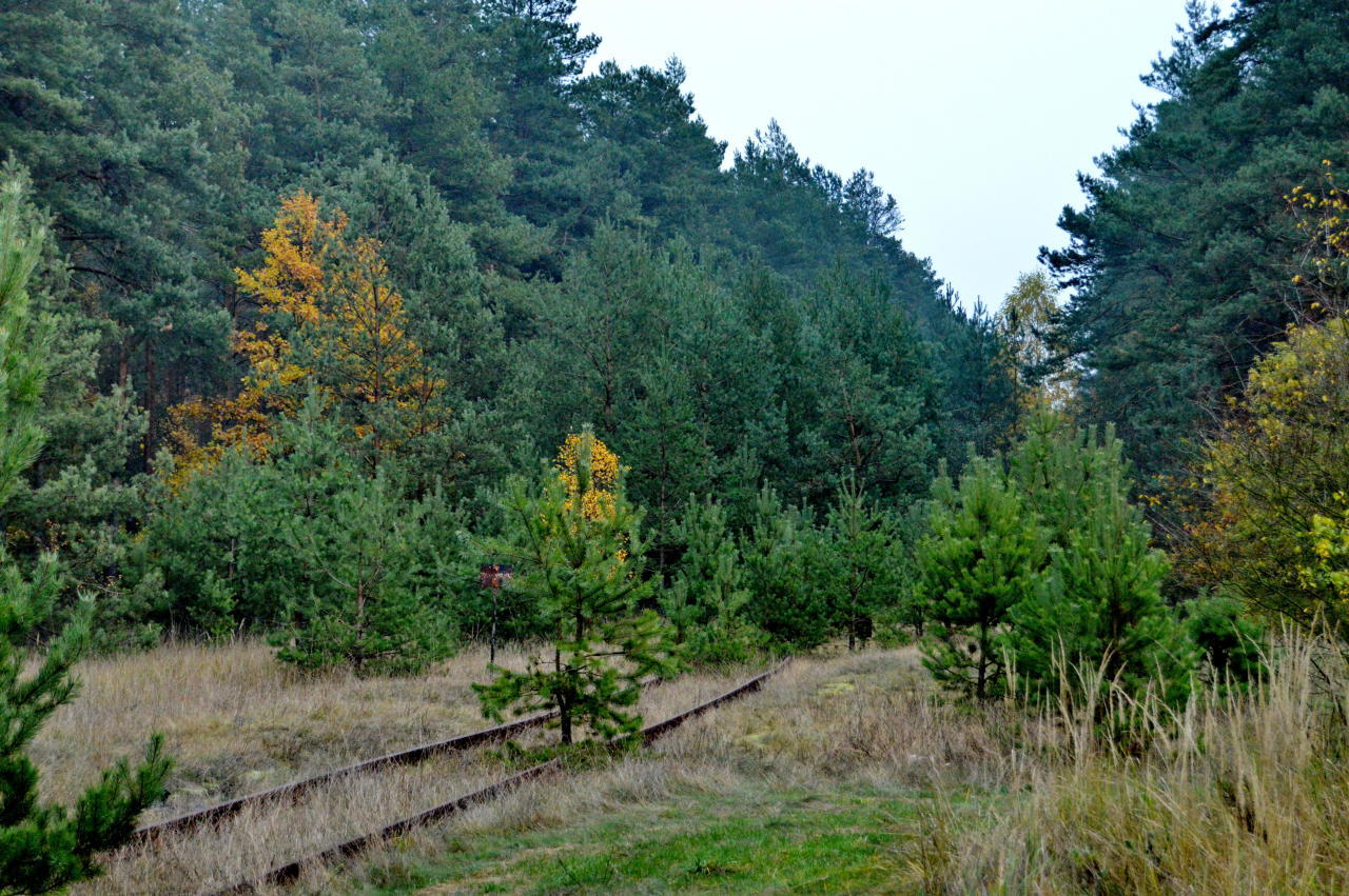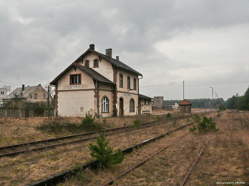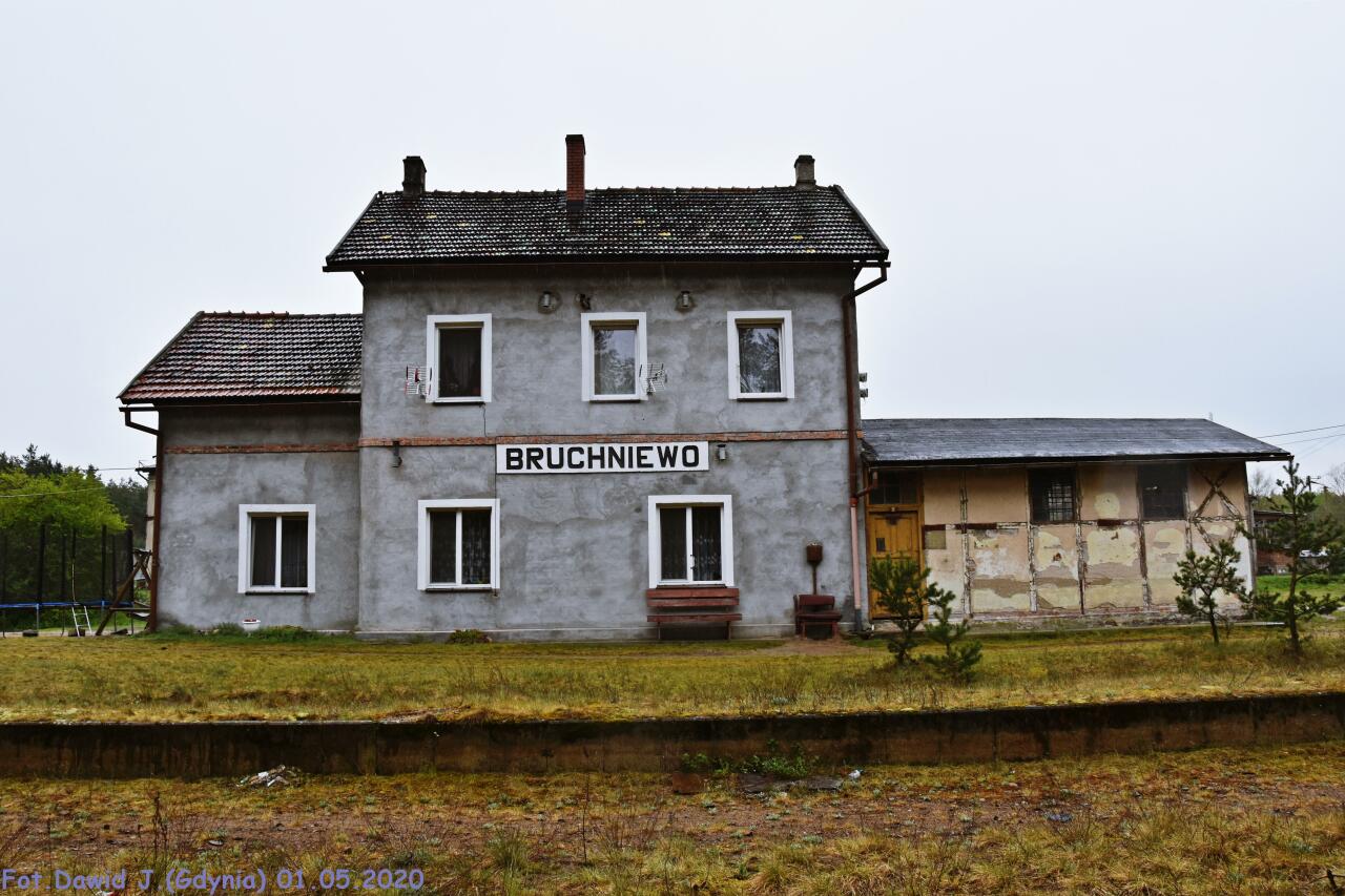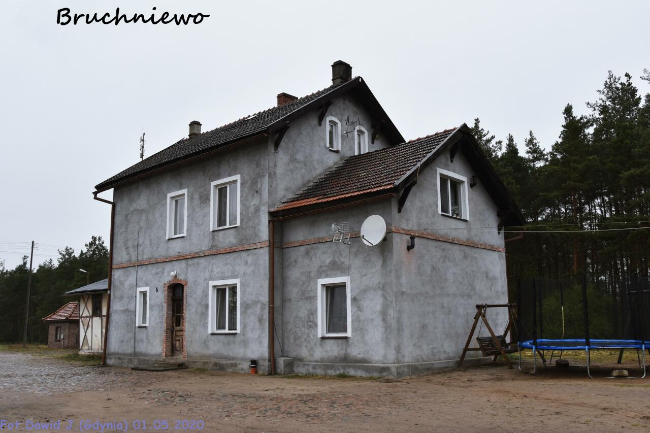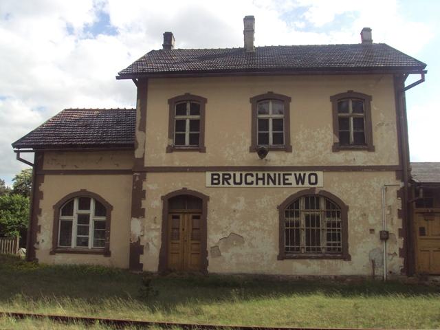 Bruchniewo. Nieczynna stacja. Tory porosłe zielskiem i drzewkami. Perony, magazyn towarowy i dworzec. Widok od strony Pruszcza Bagienicy.