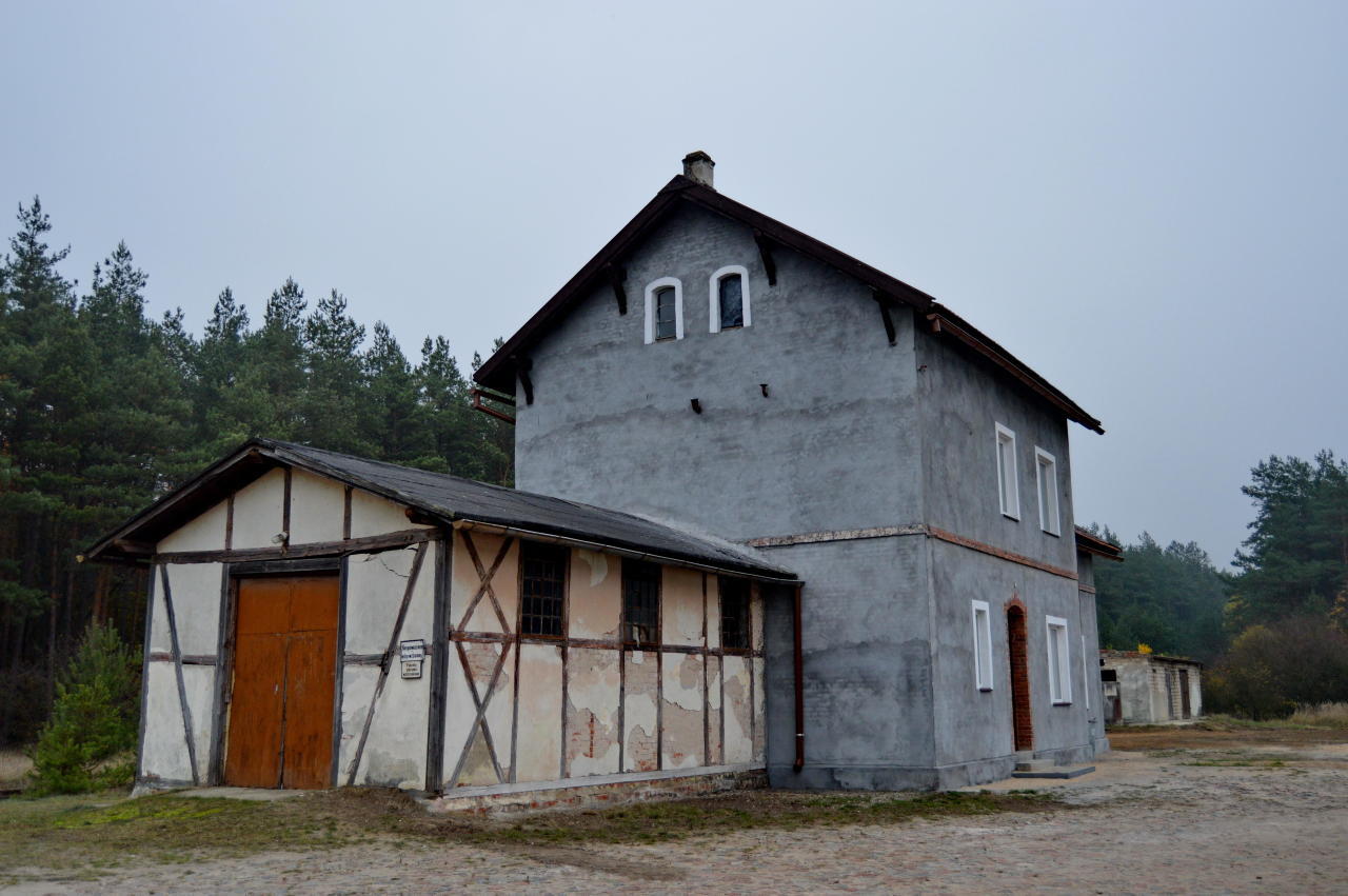 Dawny budynek dworcowy z przyległym budynkiem magazynu i budynek WC. Obiekty widoczne od strony miejsca, w którym kiedyś znajdowały się tory. Widok w kierunku Terespola Pomorskiego.