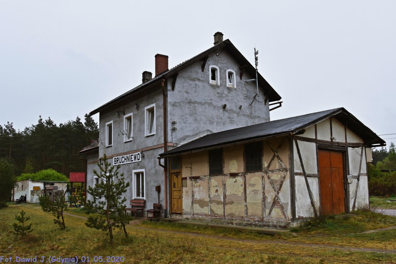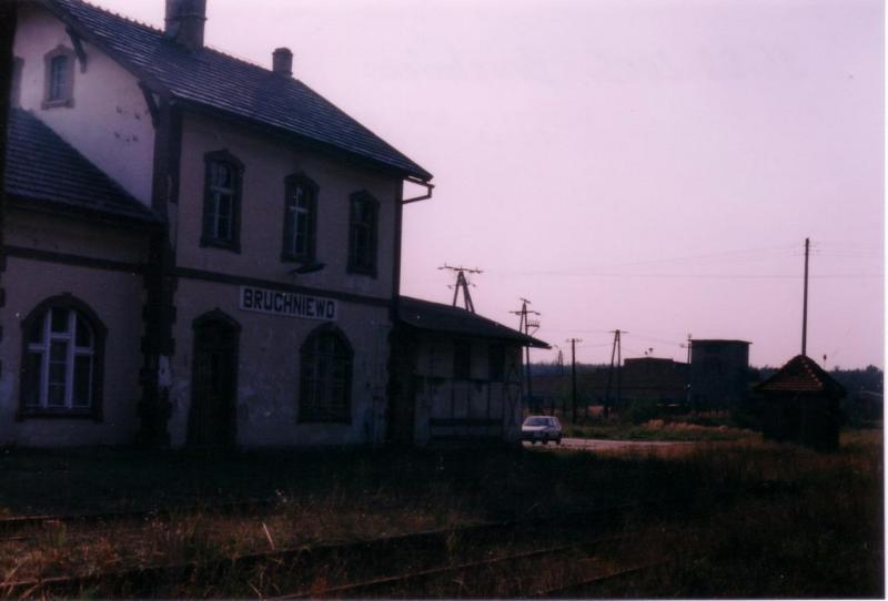 Nieczynna stacja Bruchniewo - widok od strony Pruszcza Bagienicy. W tle magazyn towarowy i dawny dworzec.