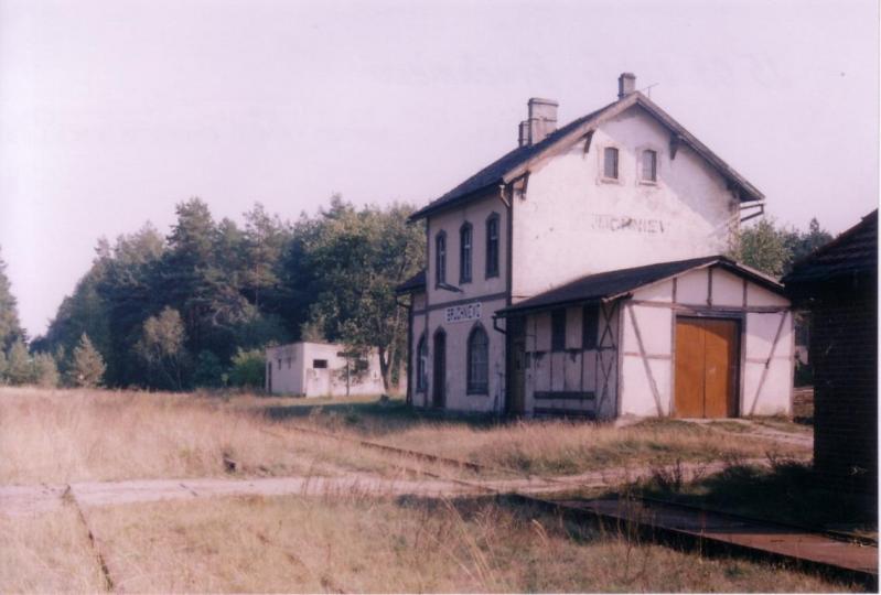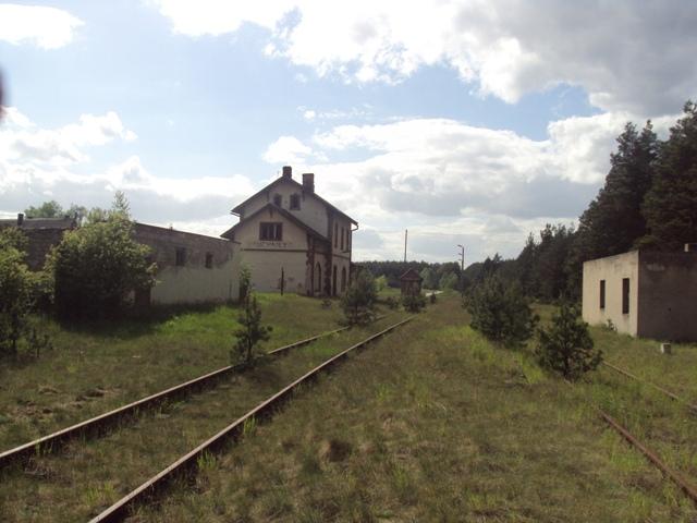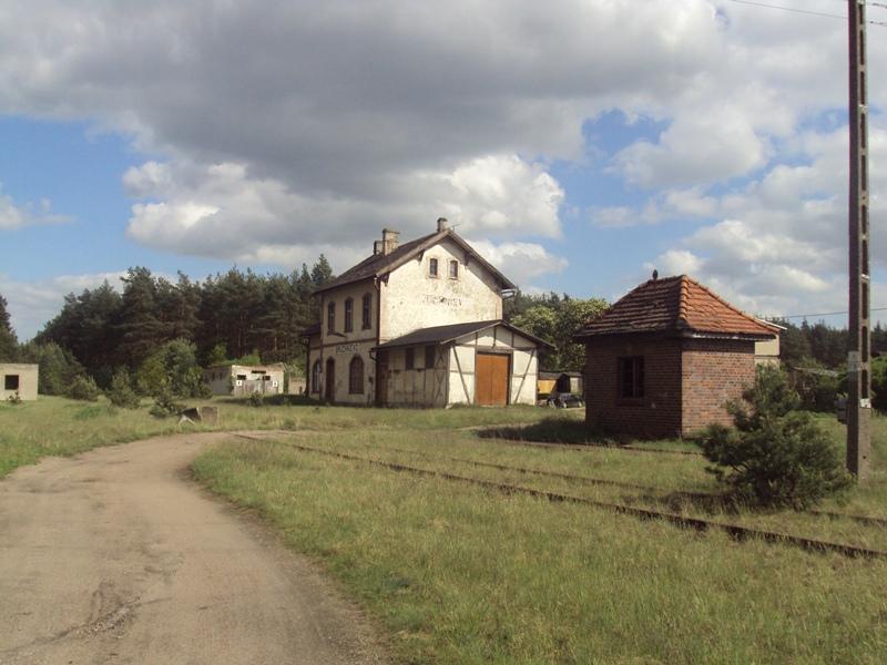 Widok na dawną stację od strony wjazdu z Terespola Pomorskiego. Po lewej toalety. W tle dawny dworzec.