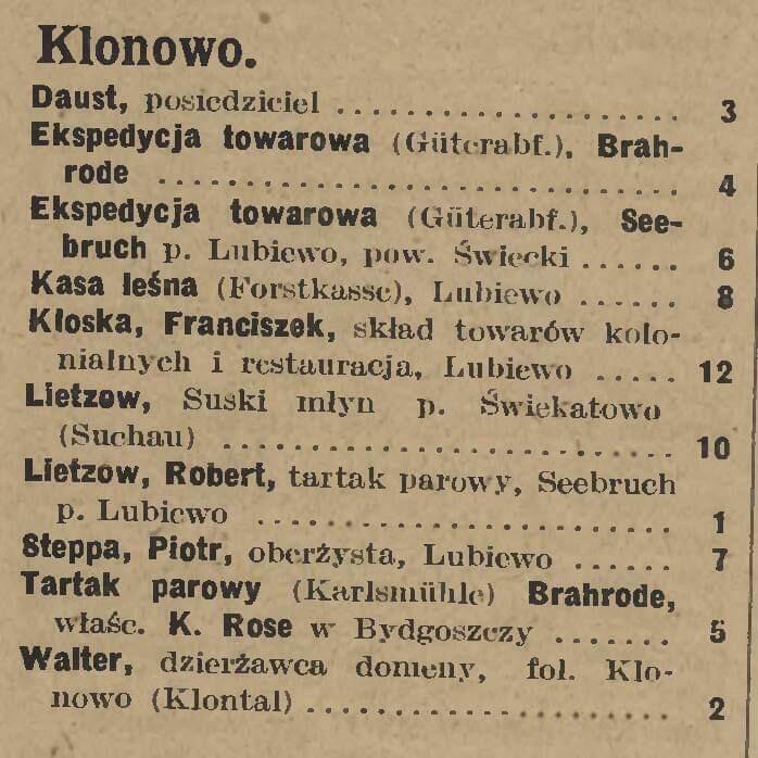 Książka telefoniczna z 1920 roku. Numery telefonów między innymi do ekspedycji towarowych dla stacji Brahrode czyli Klonowo nad Brdą i Seebruch czyli Bruchniewo.