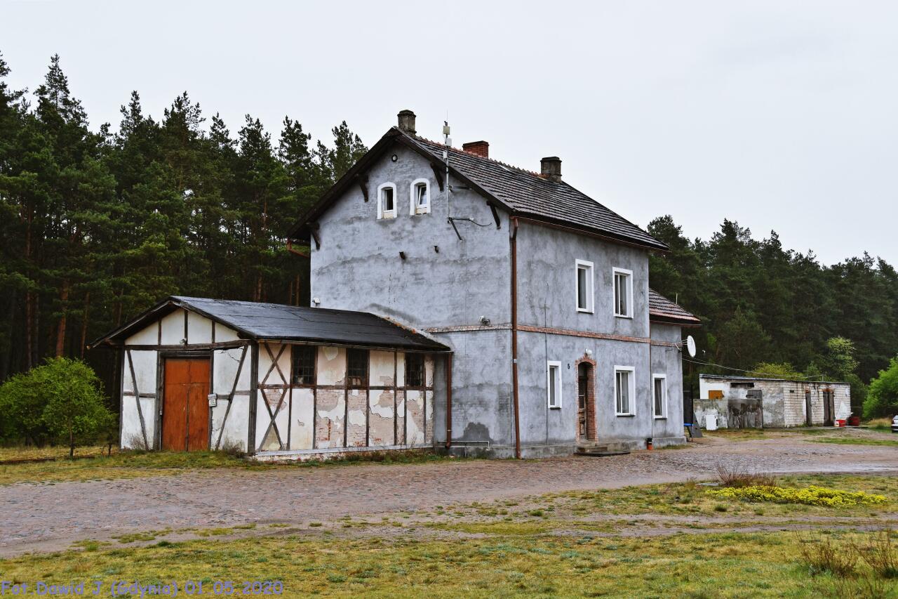 Dawny budynek dworcowy z przyległym budynkiem magazynu, widoczny od strony miejsca, w którym kiedyś znajdowały się tory. Widok w kierunku Pruszcza Bagienicy/Złotowa.