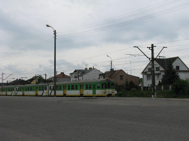 EN57 KM przy peronie. Widok z placu ładunkowego (rampa). EN57 Kolei Mazowieckich wjechał z Dęblina na tor przy peronie na stacji w Garwolinie.