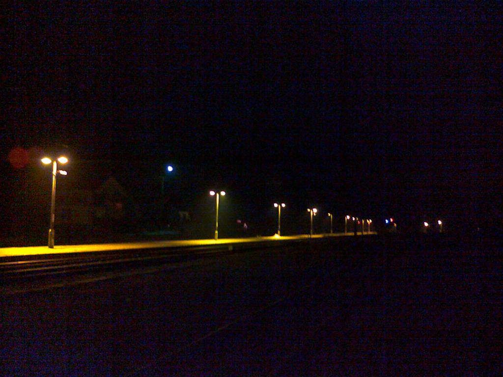 Oświetlony nocną porą peron na stacji w Garwolinie.
