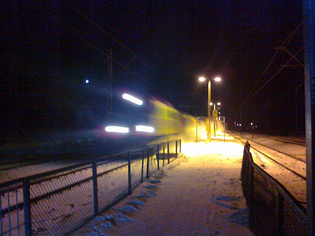 Wyjście z tunelu na peron. Właśnie przejeżdża pociąg pospieszny. Pociągi pospieszne w Garwolinie się nie zatrzymują.