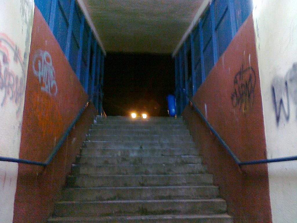 Schody którymi można dostać się na peron. Niestety większość osób wybiera drogę po torach i mało kto korzysta z tunelu.