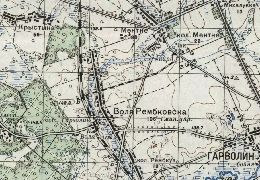 Najprawdopodobniej dowozowa linia wąskotorowa (sądząc po łukach) z Garwolina do Miętnego - na mapie radzieckiej z 1941 r.