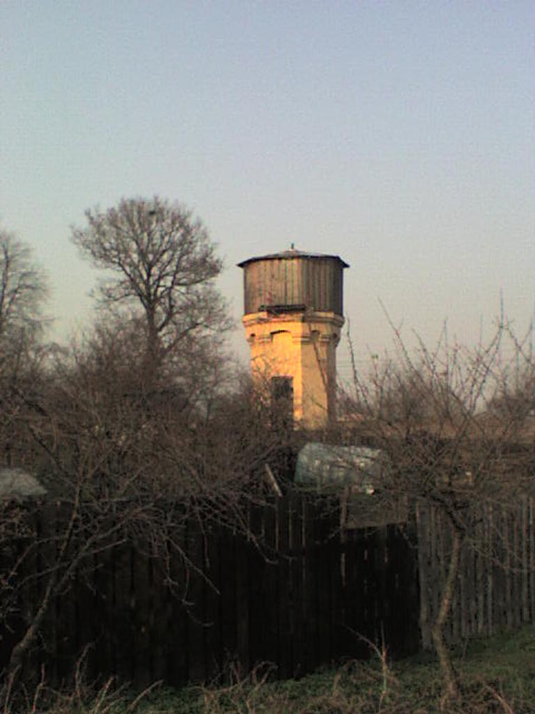 Widok na wieżę wodną od strony zabudowań przystacyjnych i drogi gruntowej biegnącej wzdłuż toru w stronę Pożoga.