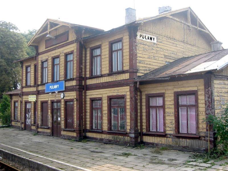 Stacja PKP Puławy. Budynek dworcowy latem. Widok od strony peronów: w prawo Dęblin, w lewo Lublin.