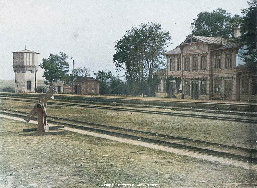 Stacja w Puławach w czasie II Wojny Światowej - zdjęcie z grupy FB Dawne Puławy. Z prawej budynek dworca, z lewej wieża wodna. Widok od strony peronów: w prawo Dęblin, w lewo Lublin.