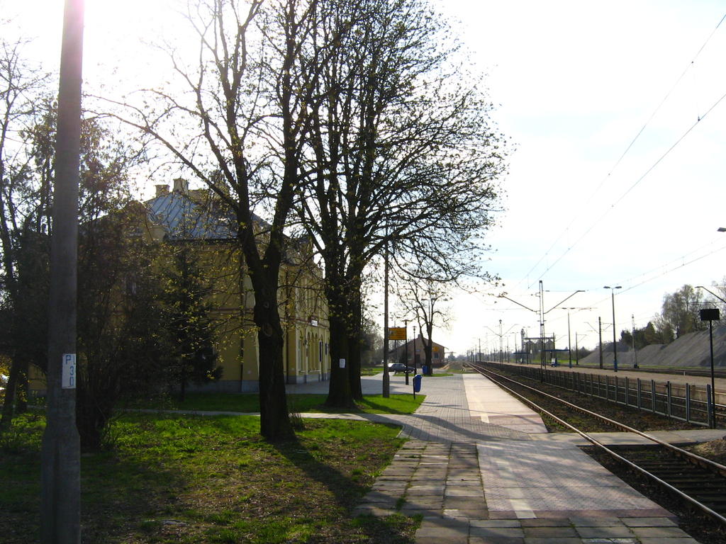 Peron przy budynku dworca. Widok w stronę Dęblina. Budynek dworca jest wyremontowany. Posiada nowe elewacje oraz odnowione wnętrze poczekalni.