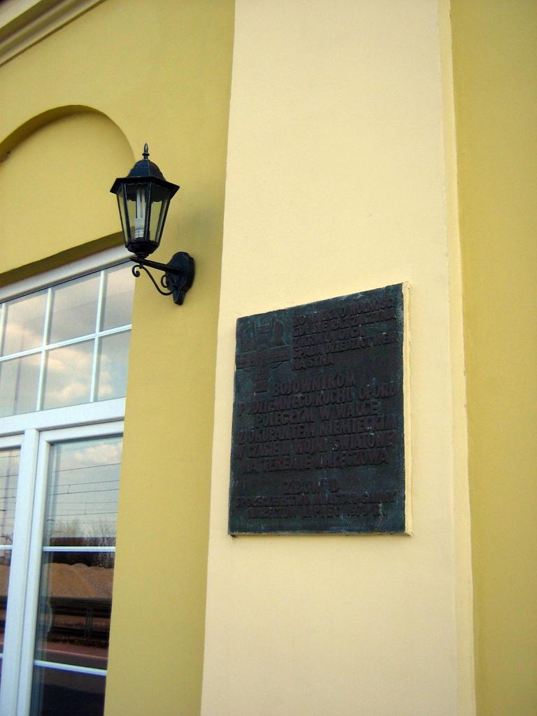 Tablica pamiątkowa zlokalizowana przy wejściu do poczekalni budynku dworca od strony peronów. Upamiętnia walczących z okupantem w czasie drugiej wojny światowej.