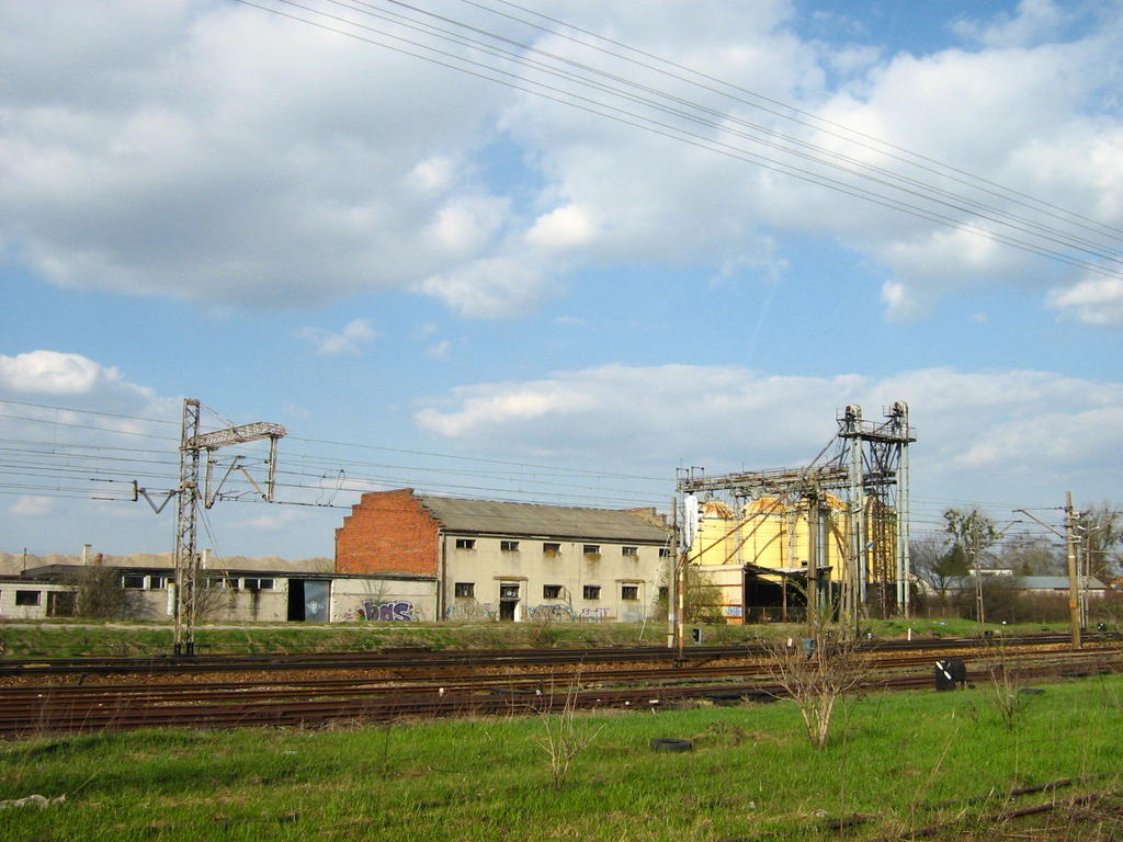 Budynki magazynowe i inne zabudowania przemysłowe zlokalizowane po drugiej stronie torów stacyjnych.