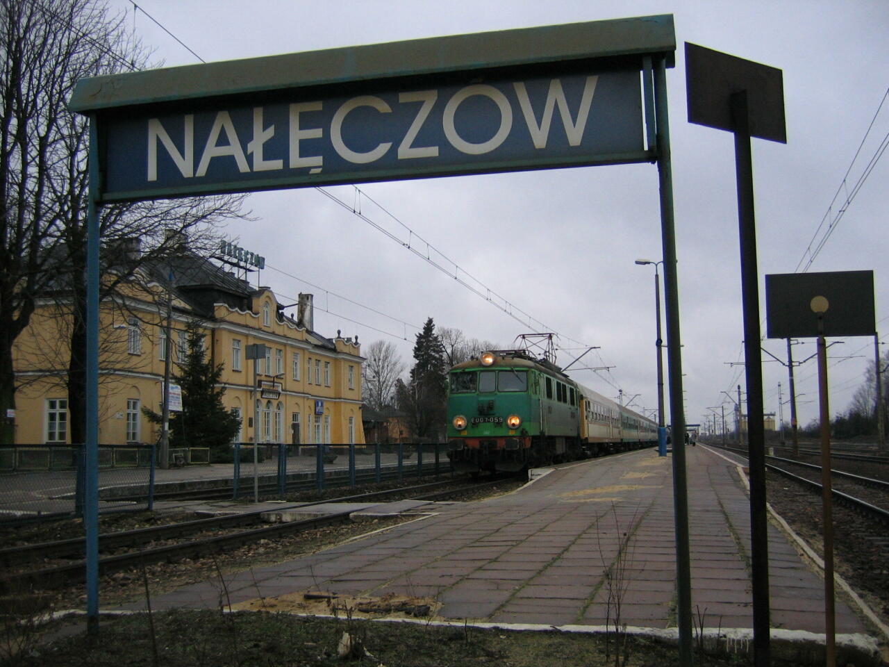 Stacja Nałęczów - tor 1, peron 2 - pociąg PE 62201 relacji Jelenia Góra - Lublin, prowadzony lokomotywą EU07-399 (MD Dęblin), budynek stacyjny. Widok w kierunku stacji Dęblin (Warszawa Wschodnia).