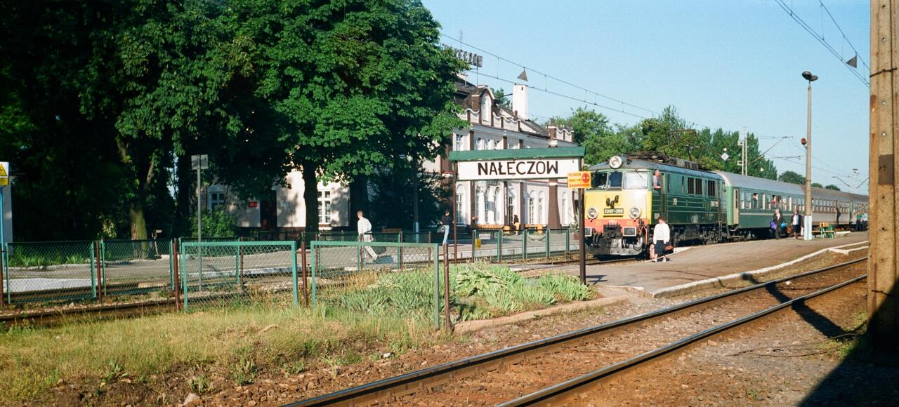 Stacja Nałęczów Wąskotorowy - tor odchodzący w prawo prowadzi na trójkąt torowy, na dalszym planie rampa ładownicza czołowo - boczna z przyległym magazynem towarowym stacji normalnotorowej Nałęczów (do magazynu towarowego dochodził również tor wąski). Pociąg MS 37 relacji Nałęczów Wąskotorowy - Opole Wąskotorowe, prowadzony lokomotywą Lxd2-296. Widok w kierunku początku linii.