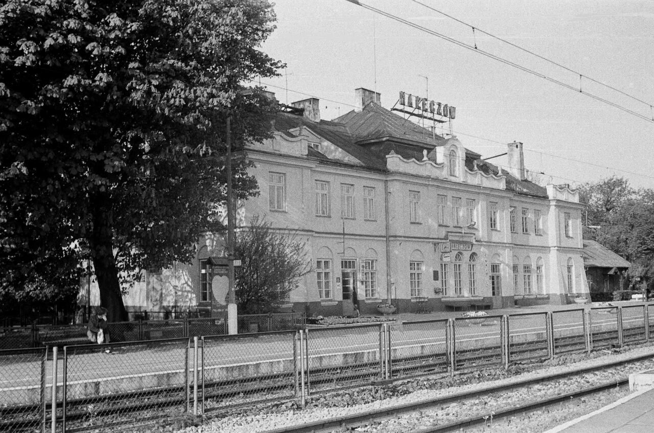 Budynek dworca PKP Nałęczów w 99 procentach. W uchwyceniu całego obiektu przeszkadzał już płot. W lewo Łopatki, Puławy, Dęblin i Warszawa, w prawo Czesławice, Lublin i Dorohusk.