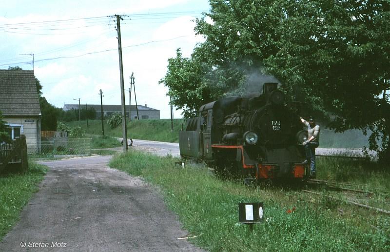 Krótki pociąg zdawczy do Powidza z Gniezna Wąskotorowego. W wagonie krytym przywieziono nawozy i środki ochrony roślin, które są właśnie wyładowywane. Węglarka transportowana na lawecie jest przeznaczona dla jednostki wojskowej, znajdującej się na przedmieściach Powidza. W drodze powrotnej składu zostanie ona pozostawiona na bocznicy, natomiast Peiks zabierze wagon próżny. Widok w kierunku zachodnim (Gniezno).