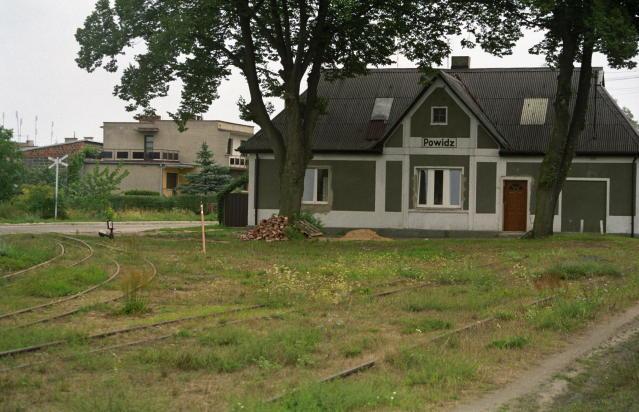 Posterunek odstępowy telefoniczny, mijanka, przystanek osobowy (nieczynny), ładownia Powidz - z lewej peron, z prawej plac ładunkowy, na dalszym planie budynek stacyjny, widok w kierunku stacji Anastazewo (Sławoszewek) - tor odchodzący w lewo.