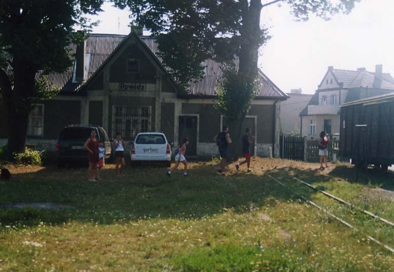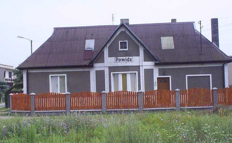 Dworzec w Powidzu. Lekko zmieniony na skutek remontu i przebudowy. Zamurowano drzwi do byłego pomieszczenia poczekalni i kasy, znajdujących się niegdyś po lewej stronie budynku (od strony ulicy Kolejowej). Mimo to, klimat dworca raczej zostanie zachowany. Po lewej - wyjazd w kierunku Anastazewa. Dwa tory, biegnące prosto to bocznice. Oba kończą się za moment kozłami oporowymi.
