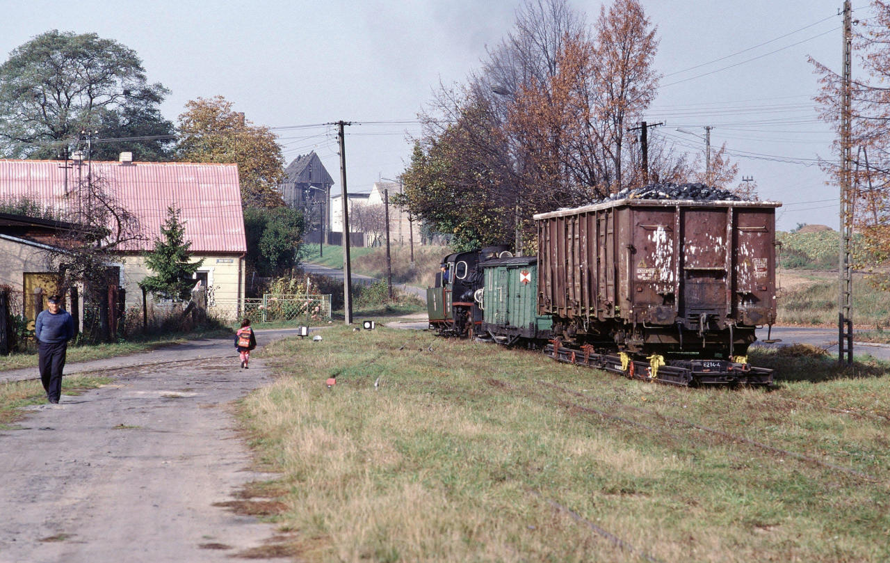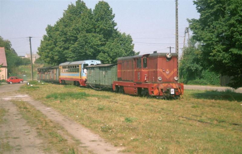 Krótki pociąg zdawczy do Powidza z Gniezna Wąskotorowego. W wagonie krytym przywieziono nawozy i środki ochrony roślin, które są właśnie wyładowywane. Węglarka transportowana na lawecie jest przeznaczona dla jednostki wojskowej, znajdującej się na przedmieściach Powidza. W drodze powrotnej składu zostanie ona pozostawiona na bocznicy, natomiast Peiks zabierze wagon próżny. Widok w kierunku zachodnim (Gniezno).