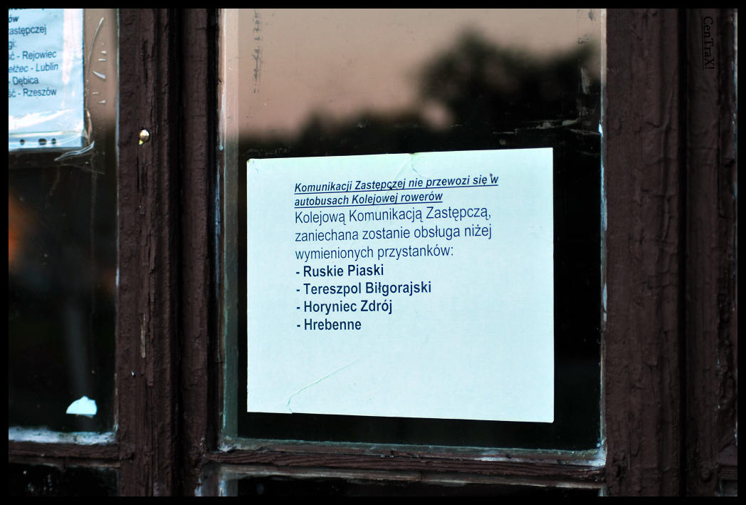 Budynek dworca od strony peronu i wjazdu z Zawady/Zamościa. Na stacji skład pociągu pośpiesznego "Solina".