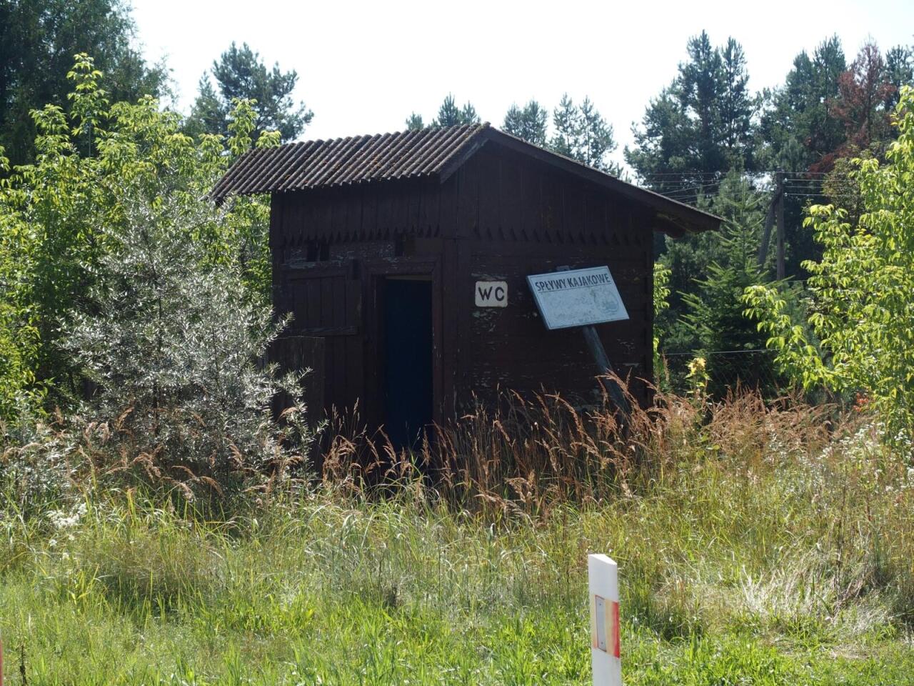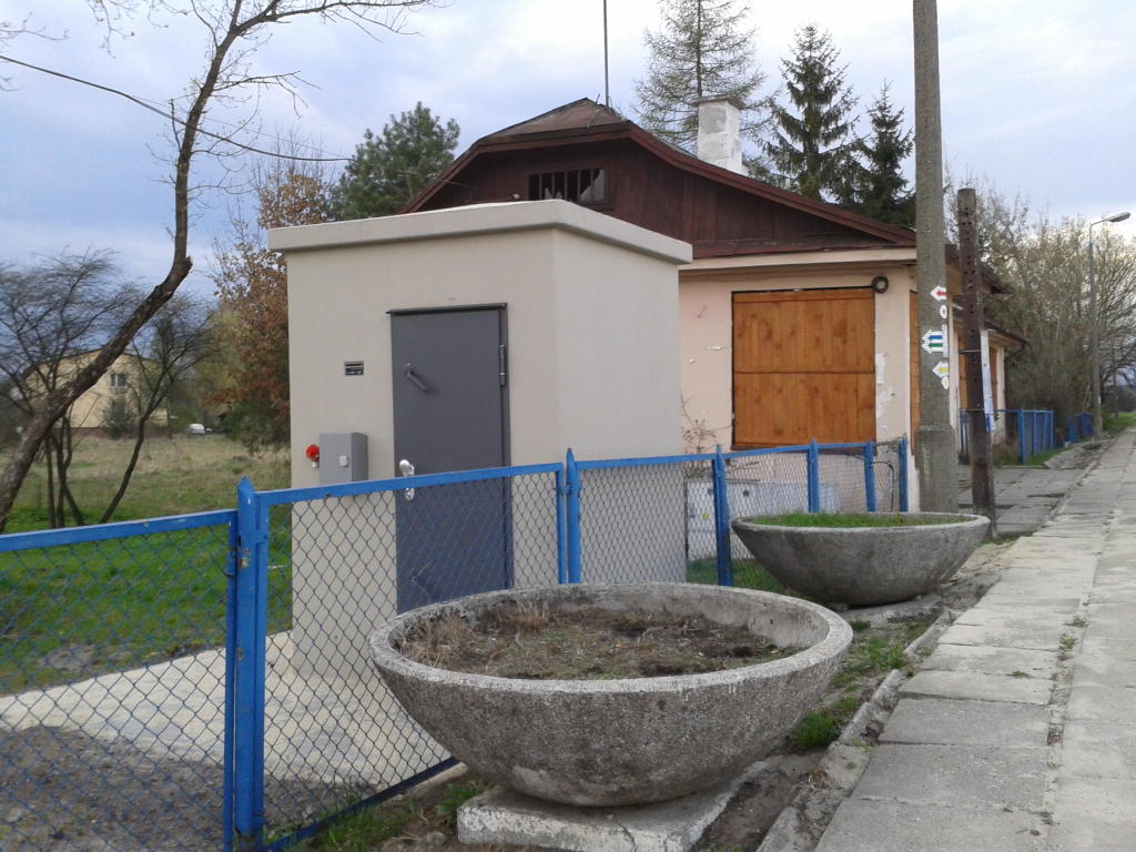 Zwierzyniec, szafa z urządzeniami sterowniczymi przejazdu kolejowego (za plecami). W tle zamknięty budynek dworca. Widok od strony ul. Kolejowej.