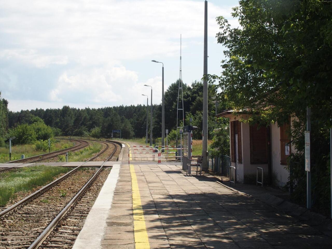 Peron jest podzielony na dwie części przez ulicę Kolejową. Z lewej tor LHS. Widok w kierunku Zwierzyńca Towarowego.
