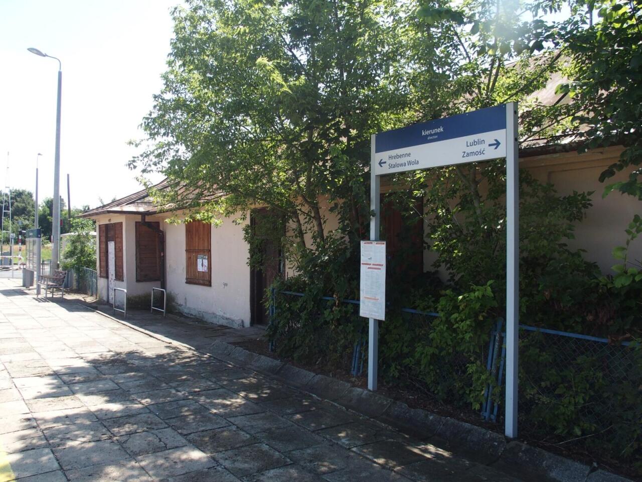 Budynek dworca, stan na 2021 r. W lewo Zwierzyniec Towarowy, dalej Biłgoraj i Hrebenne, w prawo Zawada/Zamość. Na pierwszym planie tor LHS.