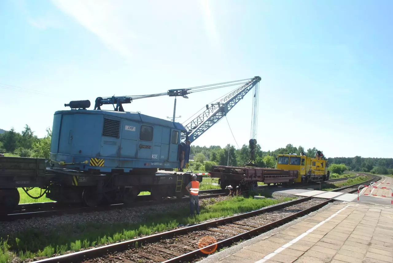 Praca dźwigu EDK na torach linii LHS w Zwierzyńcu. Z prawej peron przystanku Zwierzyniec.