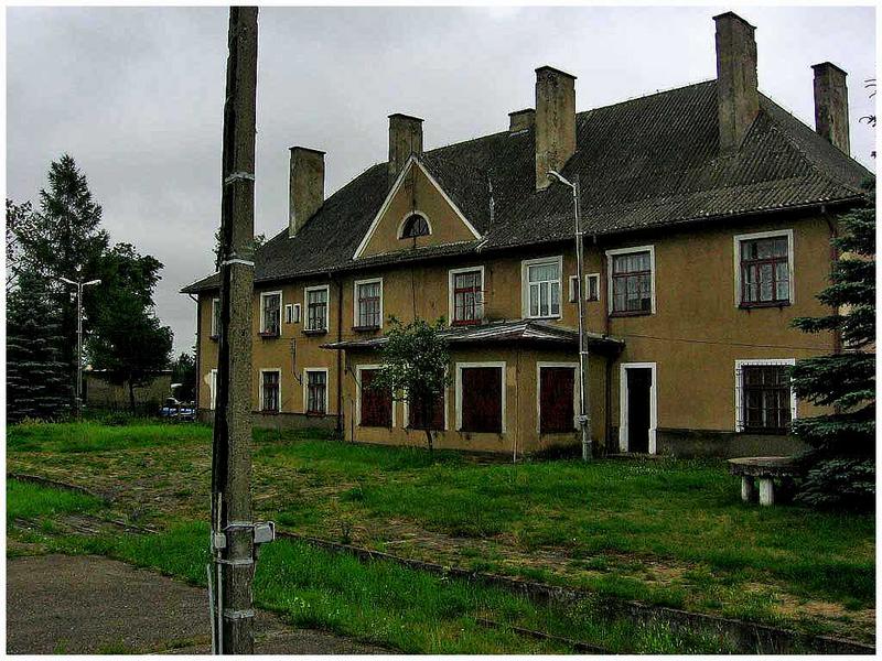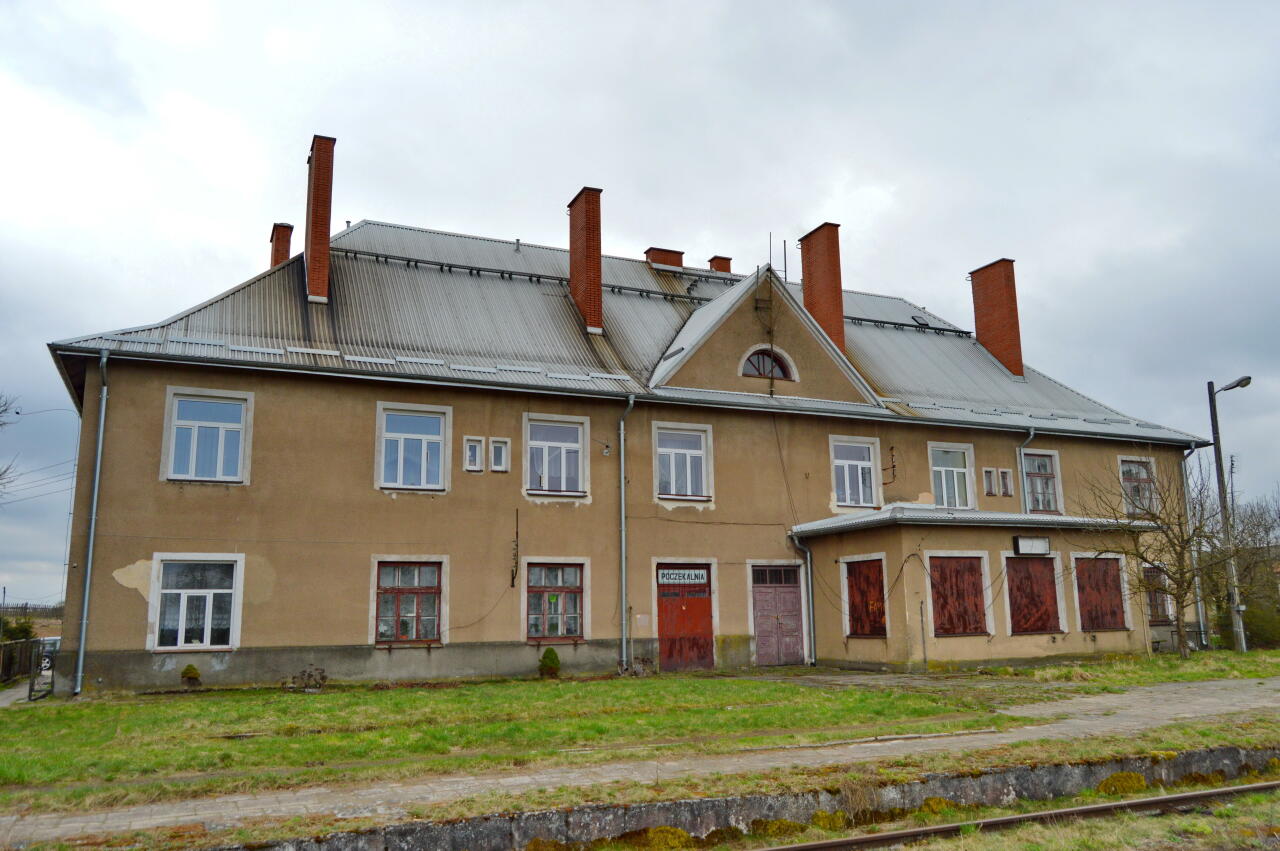 Budynek dworca od strony peronów i wjazdu z Olecka. Na parterze przybudówka, w której mieściła się nastawnia dysponująca.