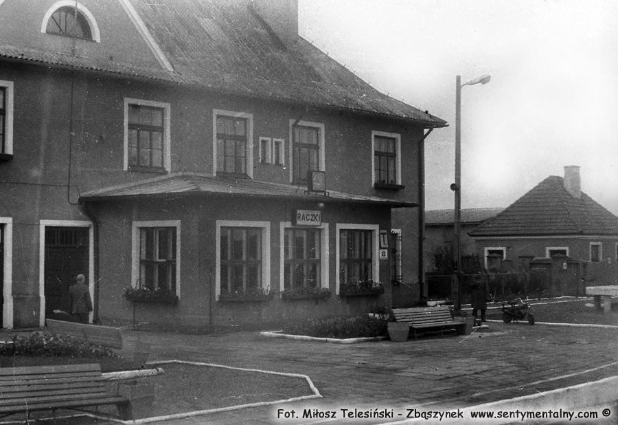 Raczki, budynek dworca od strony peronów: w lewo Suwałki, w prawo Olecko. Na parterze przybudówka, w której mieściła się nastawnia dysponująca.