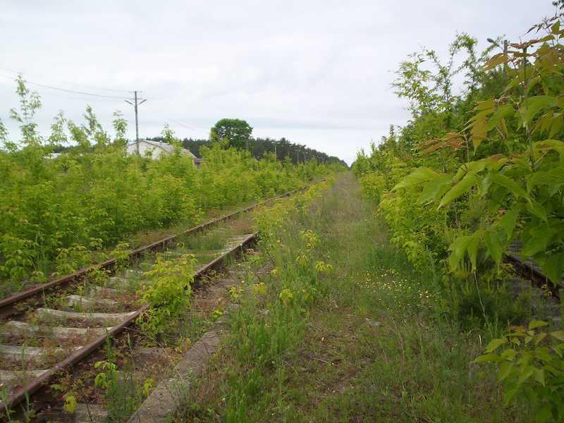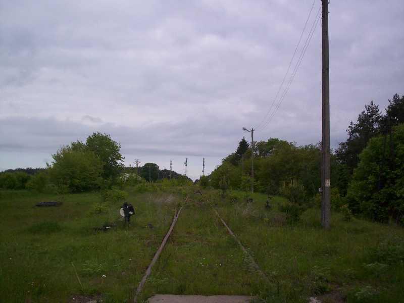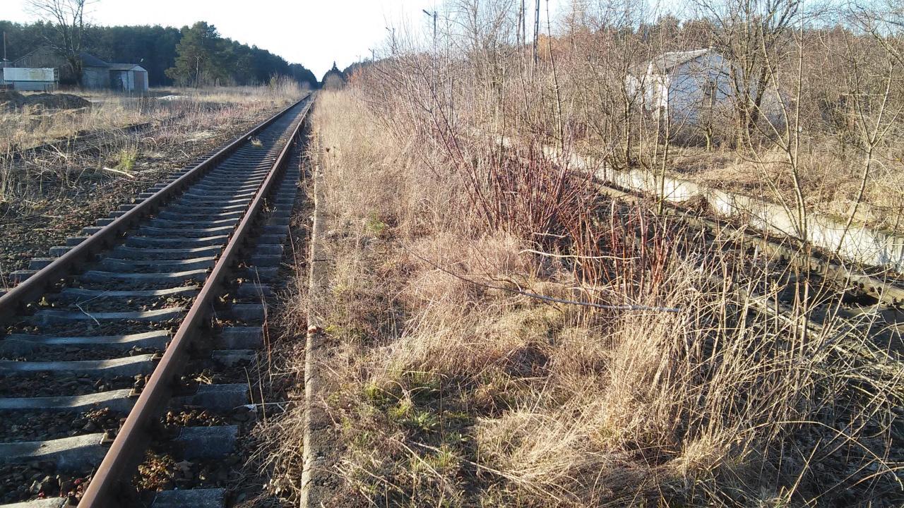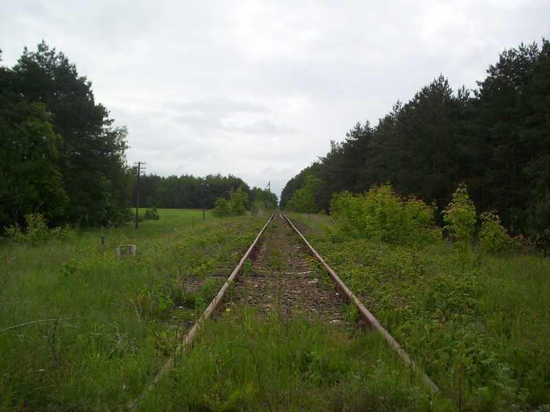Widok z przejazdu w stronę Łap, w oddali unieważniony semafor wjazdowy.
