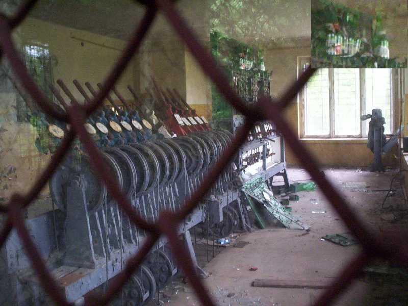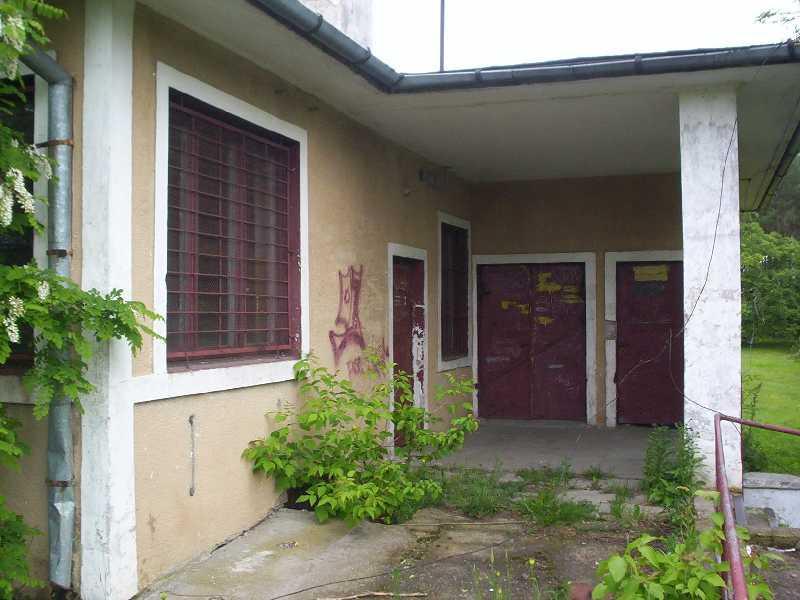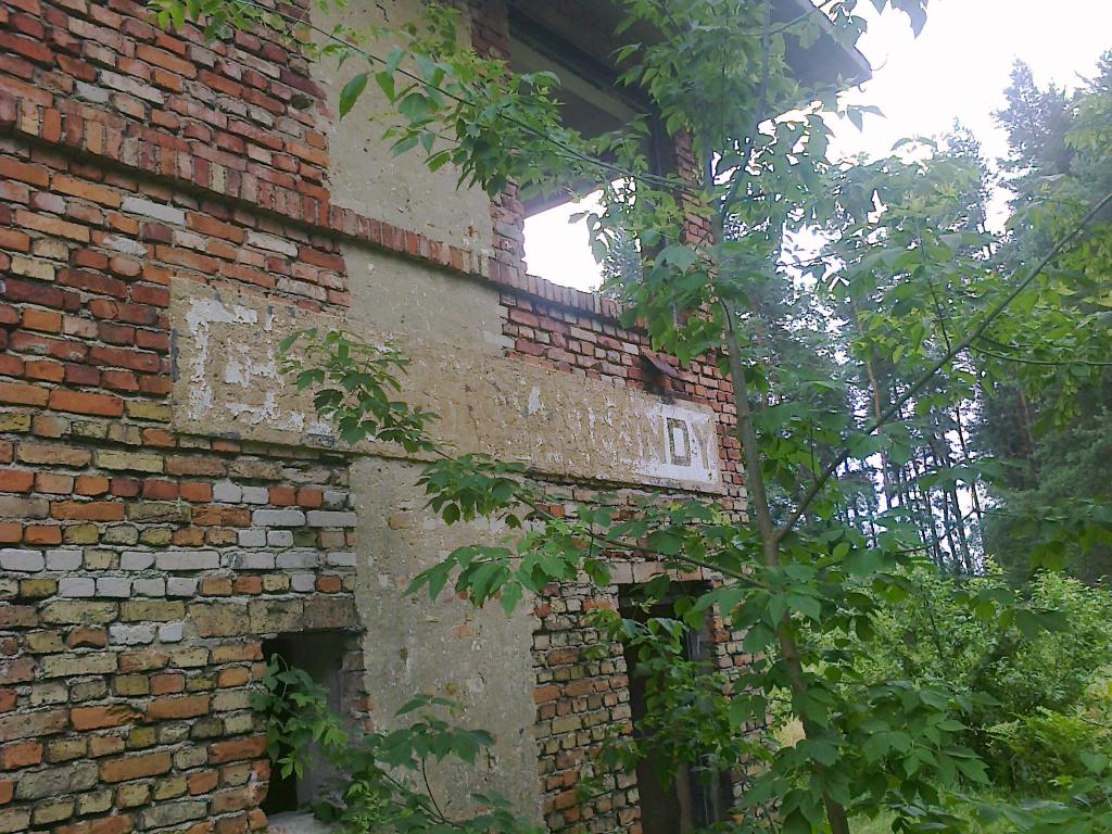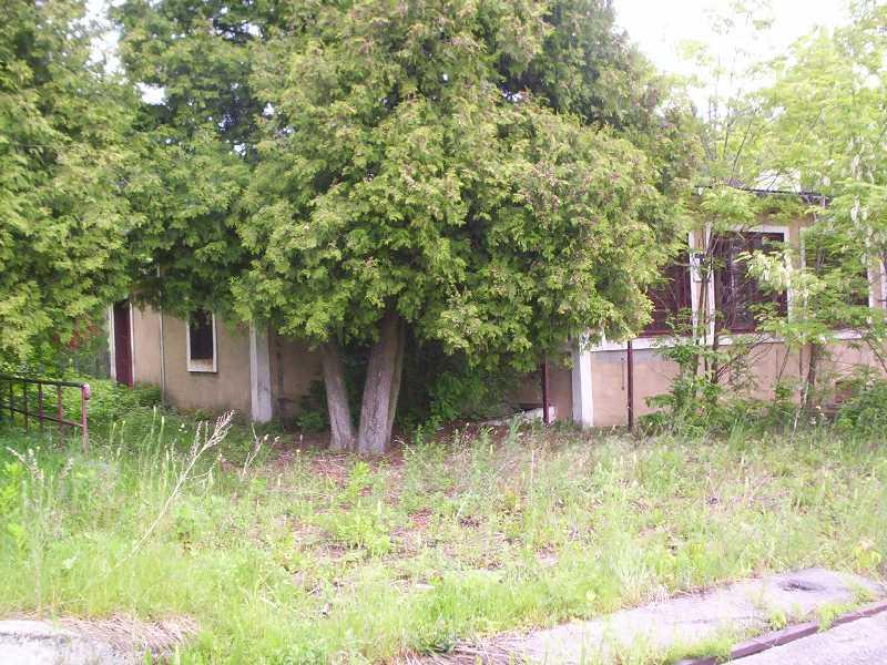 Widok na zakrzaczony budynek stacyjny - będący lustrzanym odniciem budynku w Sokołach.