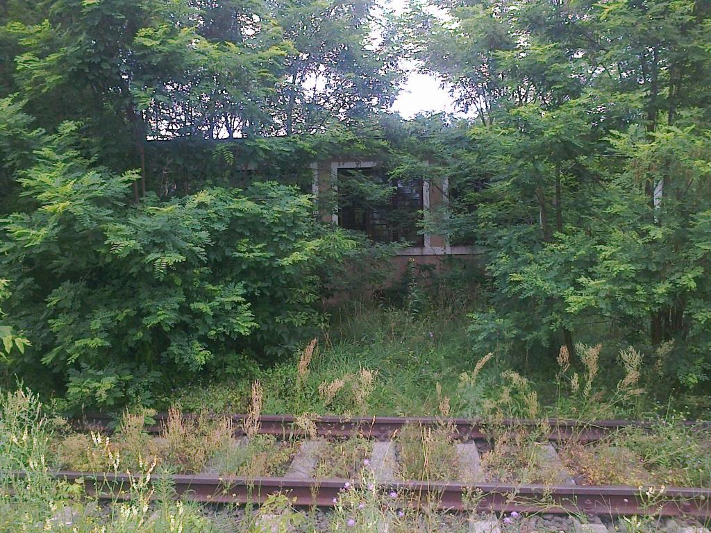 Widok z placu na stację. Skorodowana tablica, po prawej "zwieszone" semafory, a na drugim planie zza obfitą roślinnością budynek stacyjny.