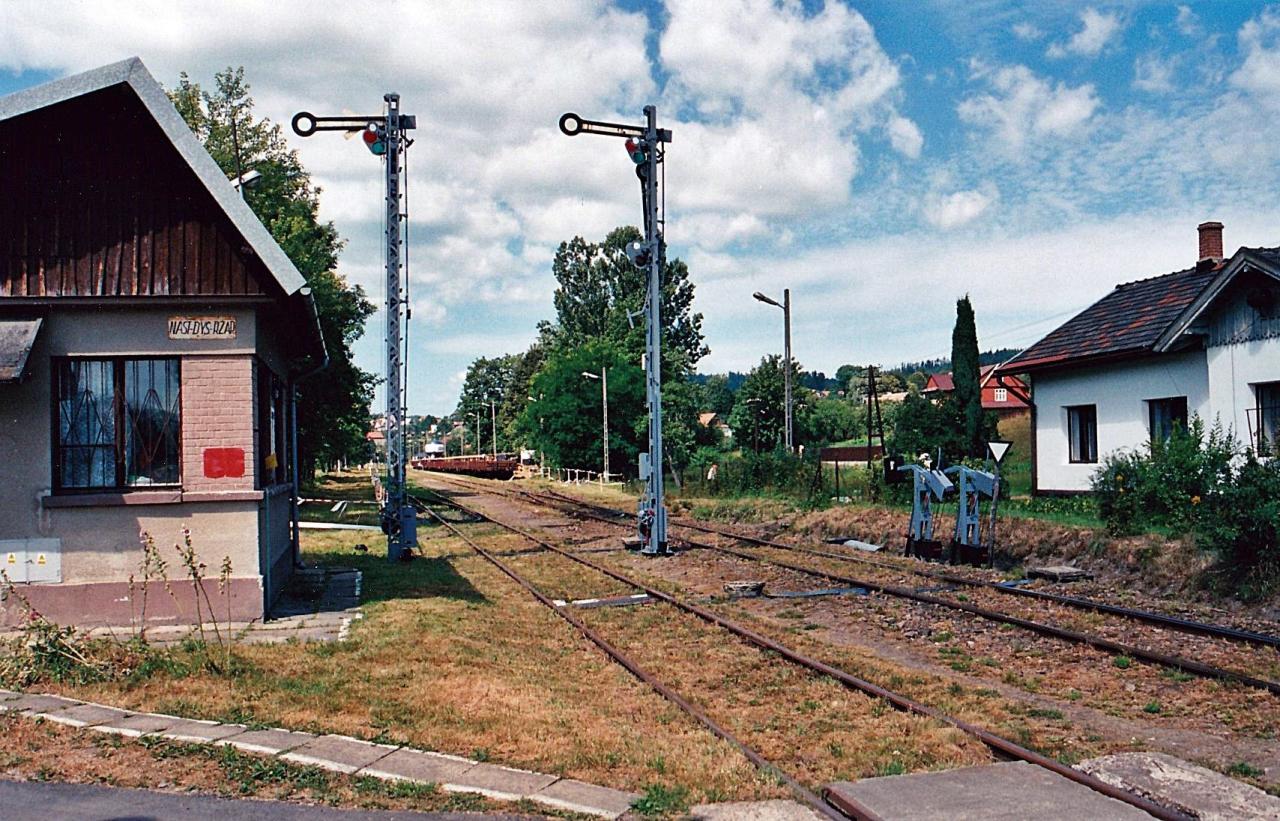 Widok na nastawnię dysponującą oraz semafory kształtowe w bezpośrednim sąsiedztwie przystanku Rabka Zaryte.
