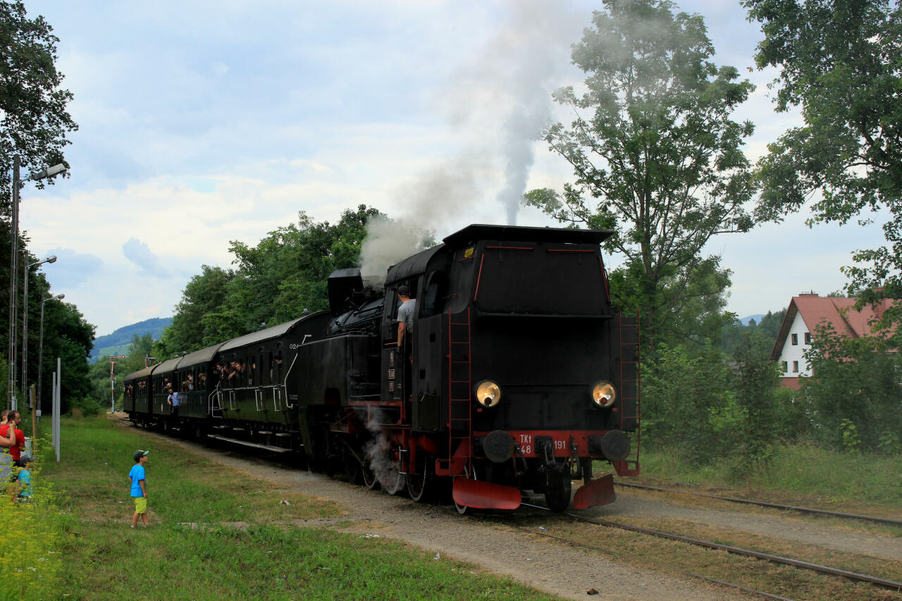 Pociąg specjalny do Chabówki z Tr12 na czele, wtacza się na peron stacji Rabka Zaryte. Widok w kierunku wschodnim (Nowy Sącz).