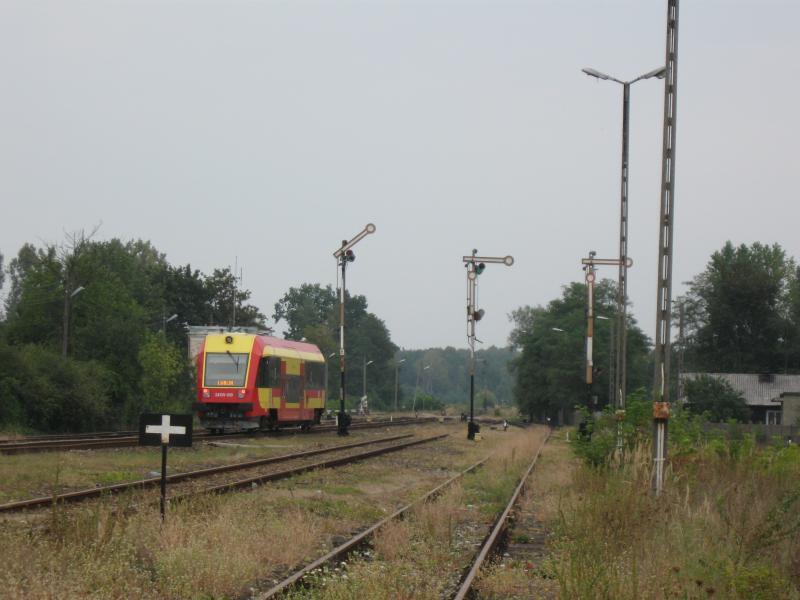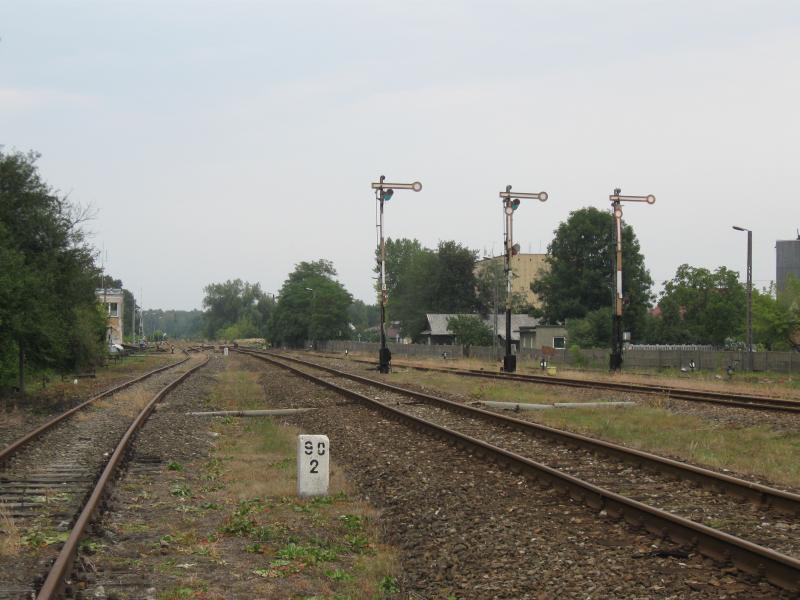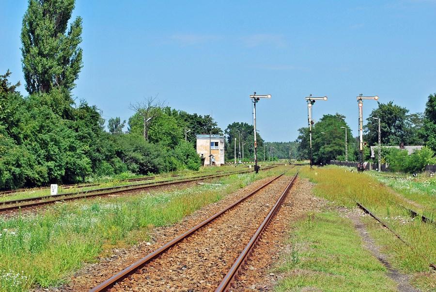 Widok na północną głowicę stacji w Lipie. Widoczne kształtowe semafory wyjazdowe oraz nastawnia dysponująca.