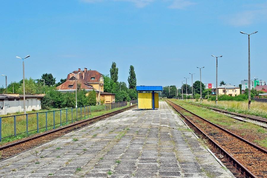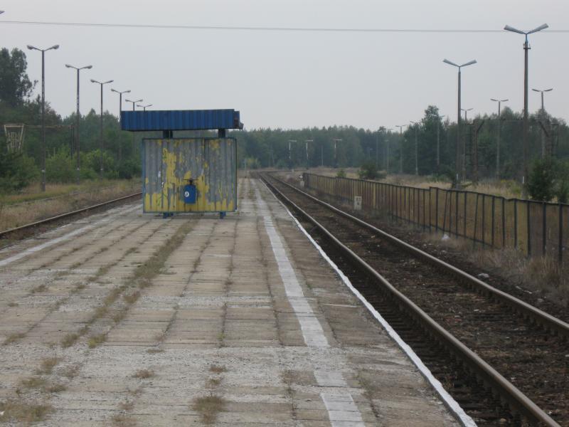 Widok z peronu na tory boczne. W oddali widoczna nasycalnia podkładów TrackTec w Lipie.