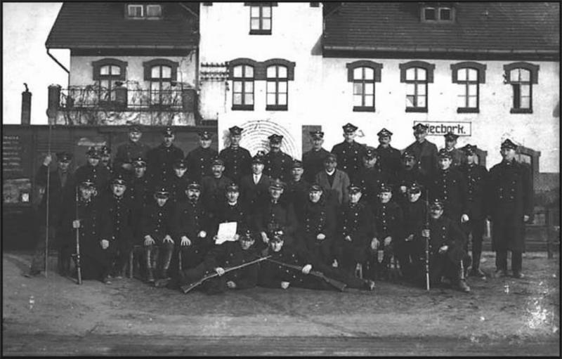 Więcborscy kolejarze przed dworcem PKP w Więcborku rok 1920. Widok od strony peronów w kierunku południowo-wschodnim (w lewo Chojnice, Złotów, w prawo Nakło nad Notecią, Pruszcz Bagienica).