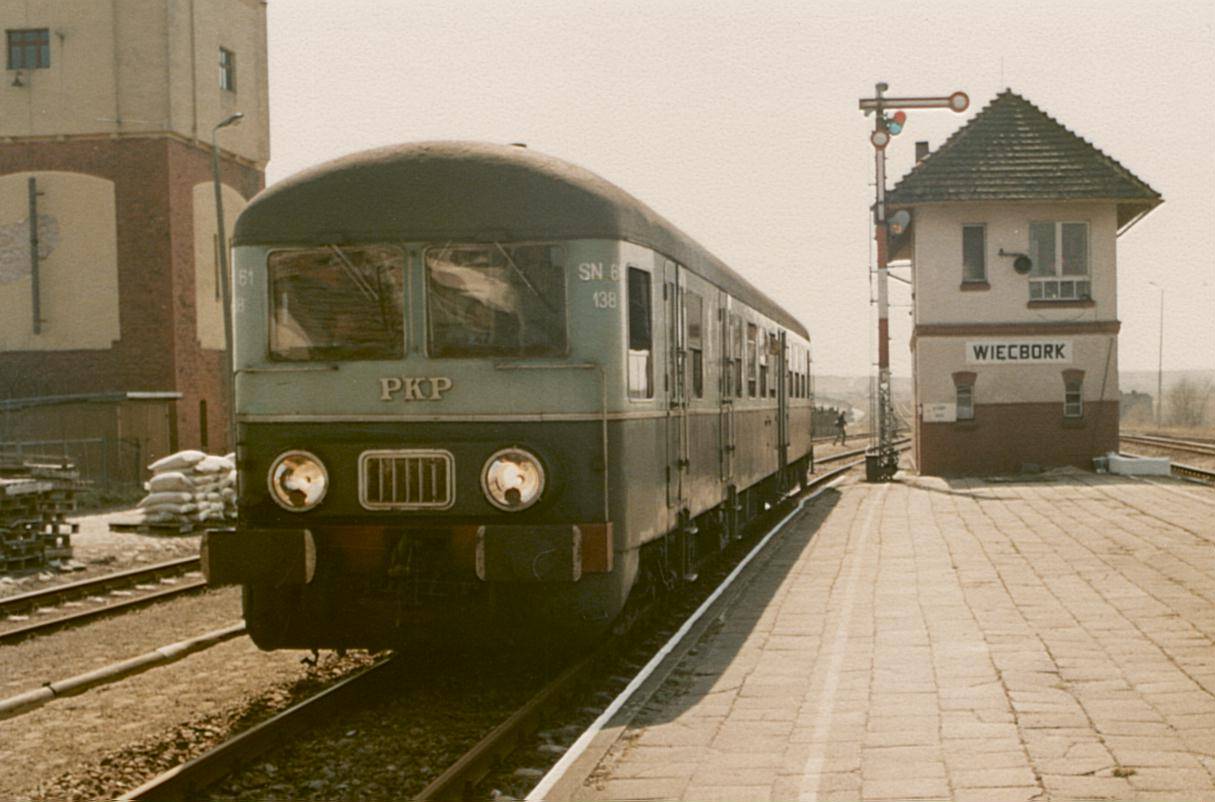 Stacja Więcbork - tor 3, peron 1 - pociąg specjalny RM 58623 relacji Pruszcz Bagienica - Złotów, obsługiwany autobusem szynowym SA101/121-002 (Zakład Taboru w Gdyni). Widoczny budynek stacyjny, wieża wodna i nastawnia dysponująca "Wb". Widok w kierunku stacji Nakło nad Notecią (Oleśnica), Pruszcz Bagienica (Świecie nad Wisłą).