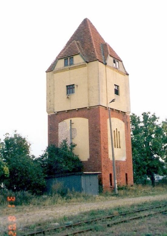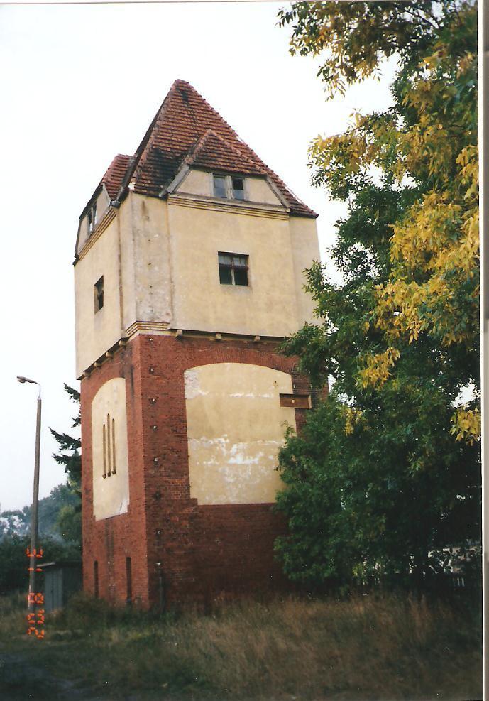 Więcbork. Kolejowa wieża wodna w 2002 r., widok od strony wjazdów z Nakła nad Notecią i Pruszcza Bagienicy, w kierunku północno-wschodnim.