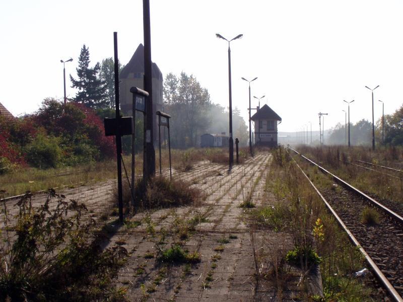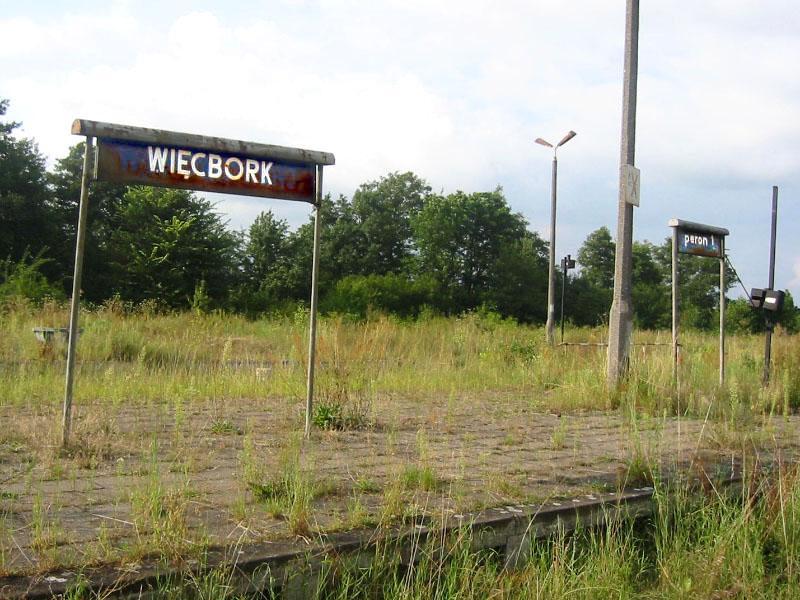 Więcbork - przygnębiający jest widok zarośniętej, popadającej w zapomnienie stacji. Peron 1, w tle nieczynna nastawnia dysponująca Wb i wieża wodna. Widok w kierunku południowo-zachodnim (Nakło nad Notecią i Pruszcz Bagienica).