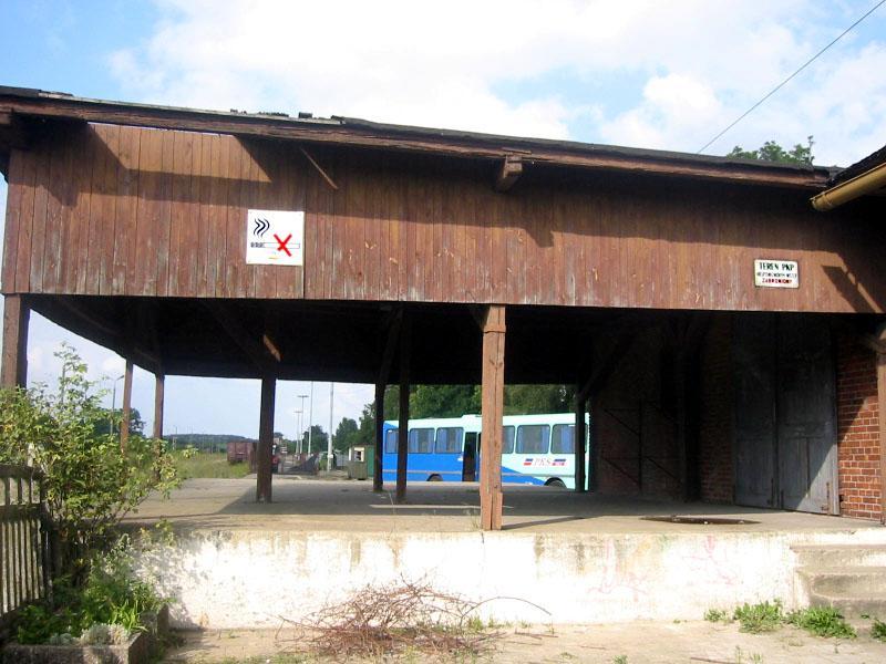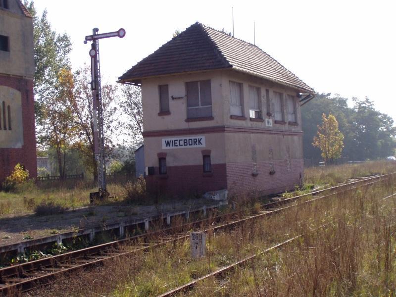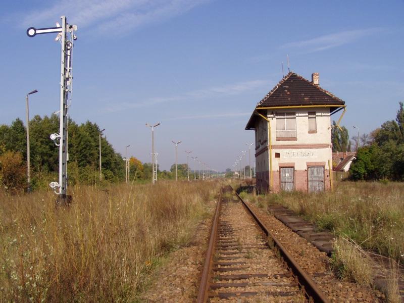 Nieczynna nastawnia dysponująca Wb, stojąca na końcu peronu 1. Widok w kierunku północno-wschodnim, od strony wjazdów z Nakła nad Notecią i Pruszcza Bagienicy.