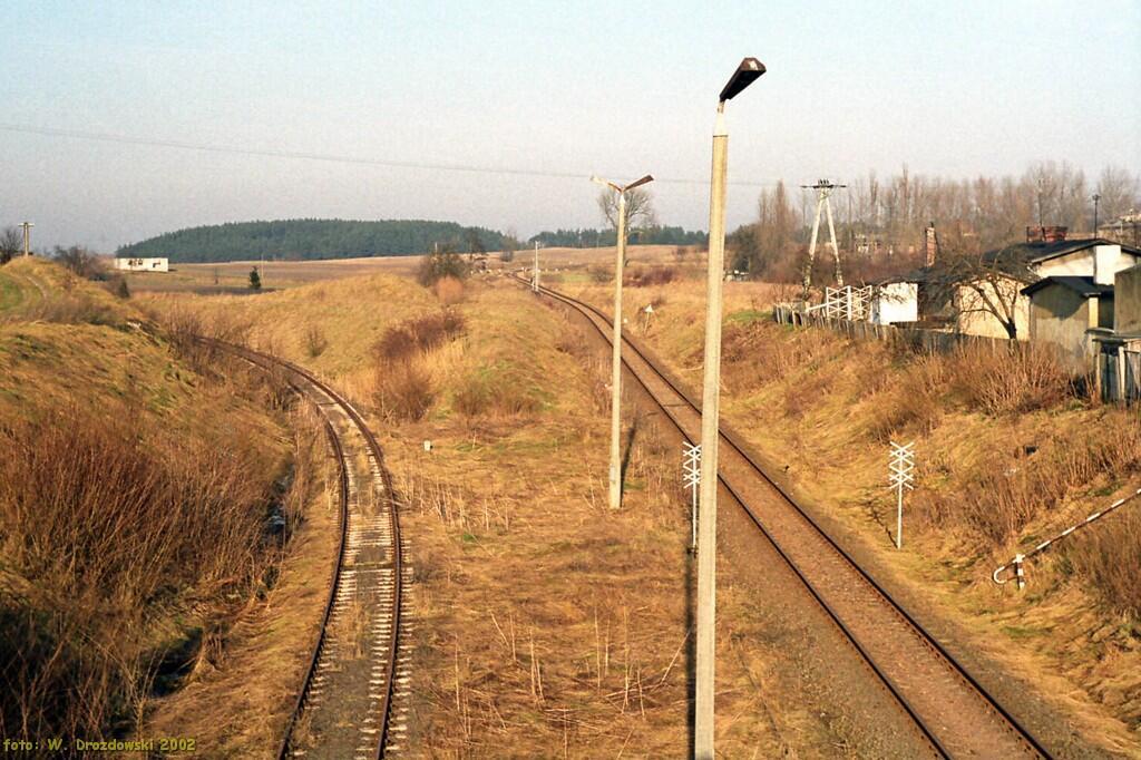 Ganz przy peronie 1 w Więcborku. Z prawej nastawnia dysponująca Wb. Z lewej fragment wieży wodnej. Widok w kierunku południowo-zachodnim (Nakło nad Notecią i Pruszcz Bagienica).