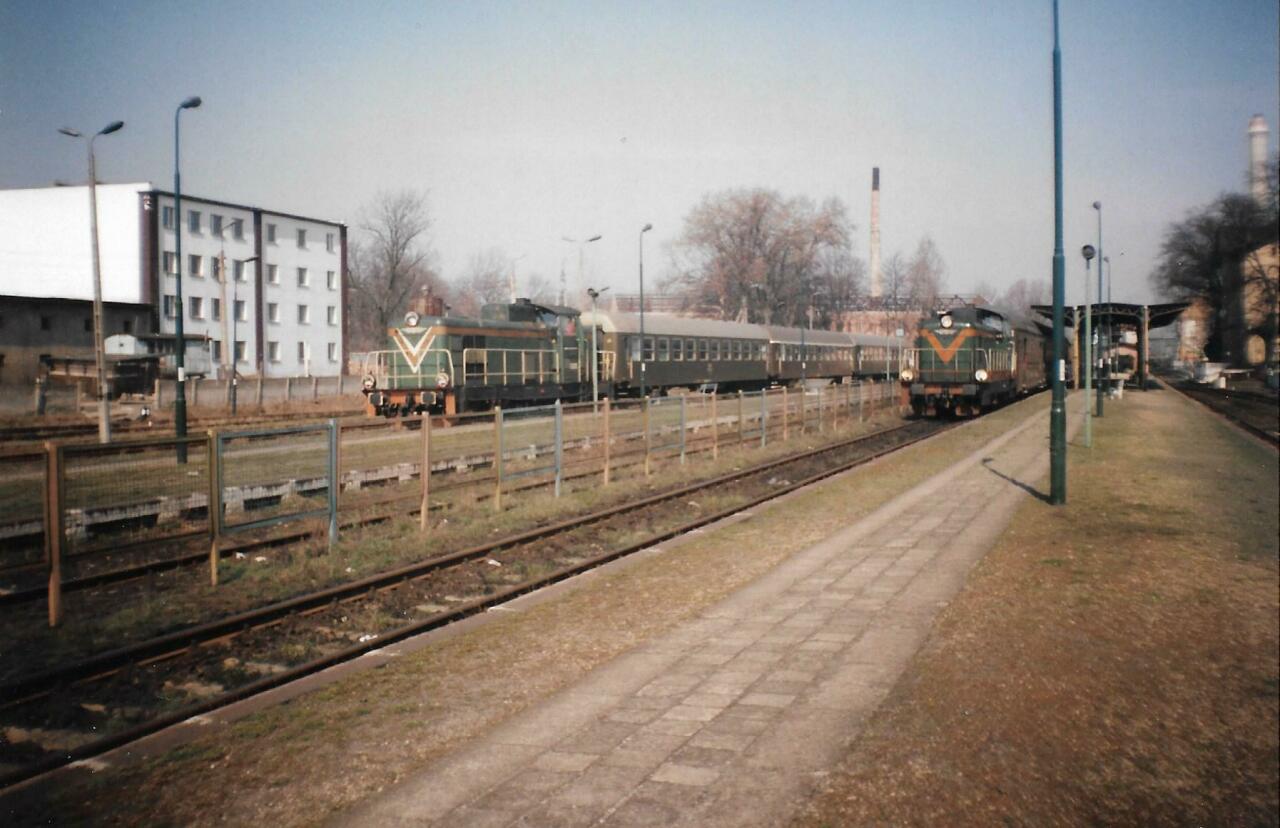Po lewej (peron 2) pociąg specjalny do Pilszcza (stonka w miejsce zdefektowanego Ty42), a po prawej (peron 1) planowy z Racławic Śl. do Raciborza. Widok w kierunku północno-zachodnim, od strony wjazdów z Pietrowic Wielkich/Raciborza i Pilszcza (dawniej z Opawy).