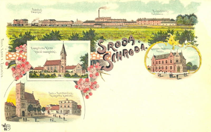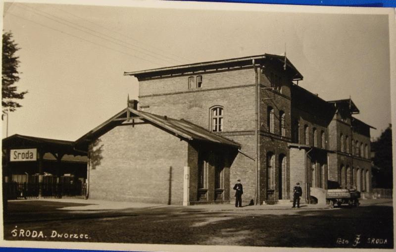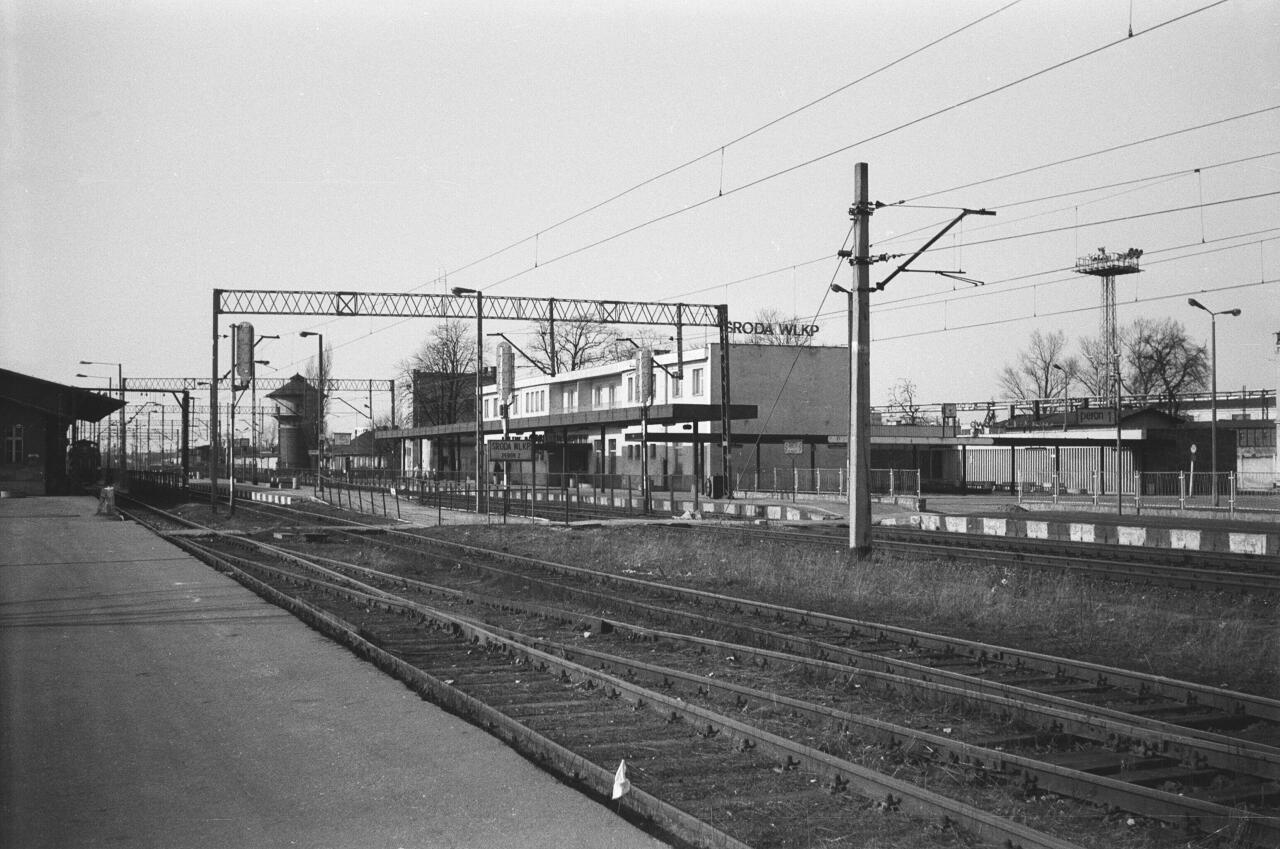 Środa Wielkopolska. Wieża wodna, perony i budynek dworca.